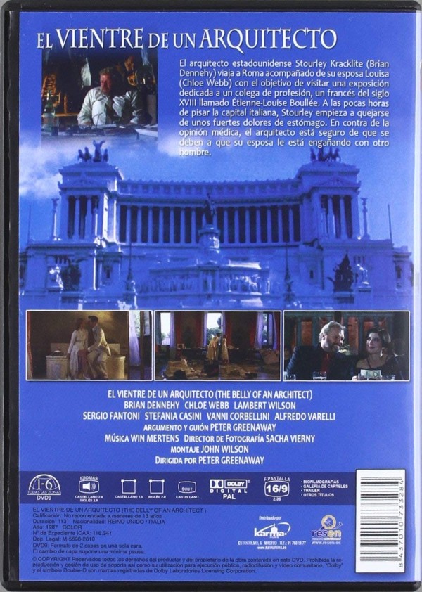 Cantidad de Discos: 1 | Lanzamiento: 2011 | Género(s): Drama | Audio: Español (Dolby Digital 2.0), Inglés (Dolby Digital 2.0) | SubtÃtulos: Español | TÃtulo: The Belly of an Architect (1987) | Director(es): Peter Greenaway | Reparto: Brian Dennehy, Chloe Webb, Lambert Wilson, Sergio Fantoni, Stefania Casini, Vanni Corbellini, Geoffrey Copleston, Alfredo Varelli, Francesco Carnelutti, Alfredo Varelli, Geoffrey Copleston, Alfredo Varelli, Alfredo Varelli, Geoffrey Copleston, Marino Masé, Marne Maitland, Claudio Spadaro | Norma / Región: PAL Multizona | Cantidad de Discos: 1 | Lanzamiento: 2011 | Género(s): Drama | Audio: Español (Dolby Digital 2.0), Inglés (Dolby Digital 2.0) | SubtÃtulos: Español | TÃtulo: The Belly of an Architect (1987) | Director(es): Peter Greenaway | Reparto: Brian Dennehy, Chloe Webb, Lambert Wilson, Sergio Fantoni, Stefania Casini, Vanni Corbellini, Geoffrey Copleston, Alfredo Varelli, Francesco Carnelutti, Alfredo Varelli, Geoffrey Copleston, Alfredo