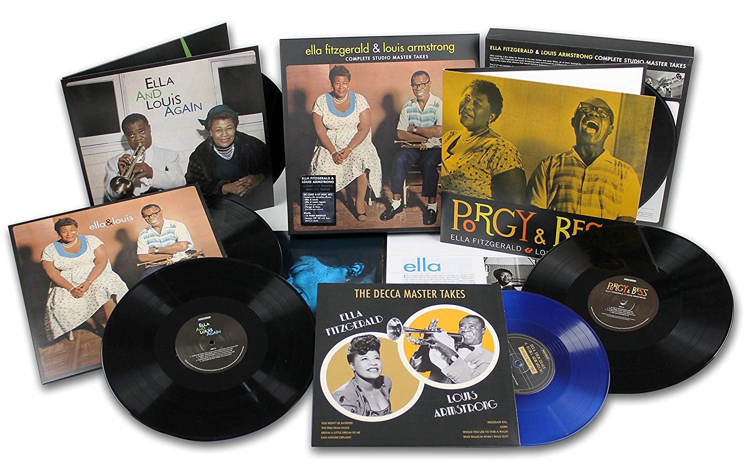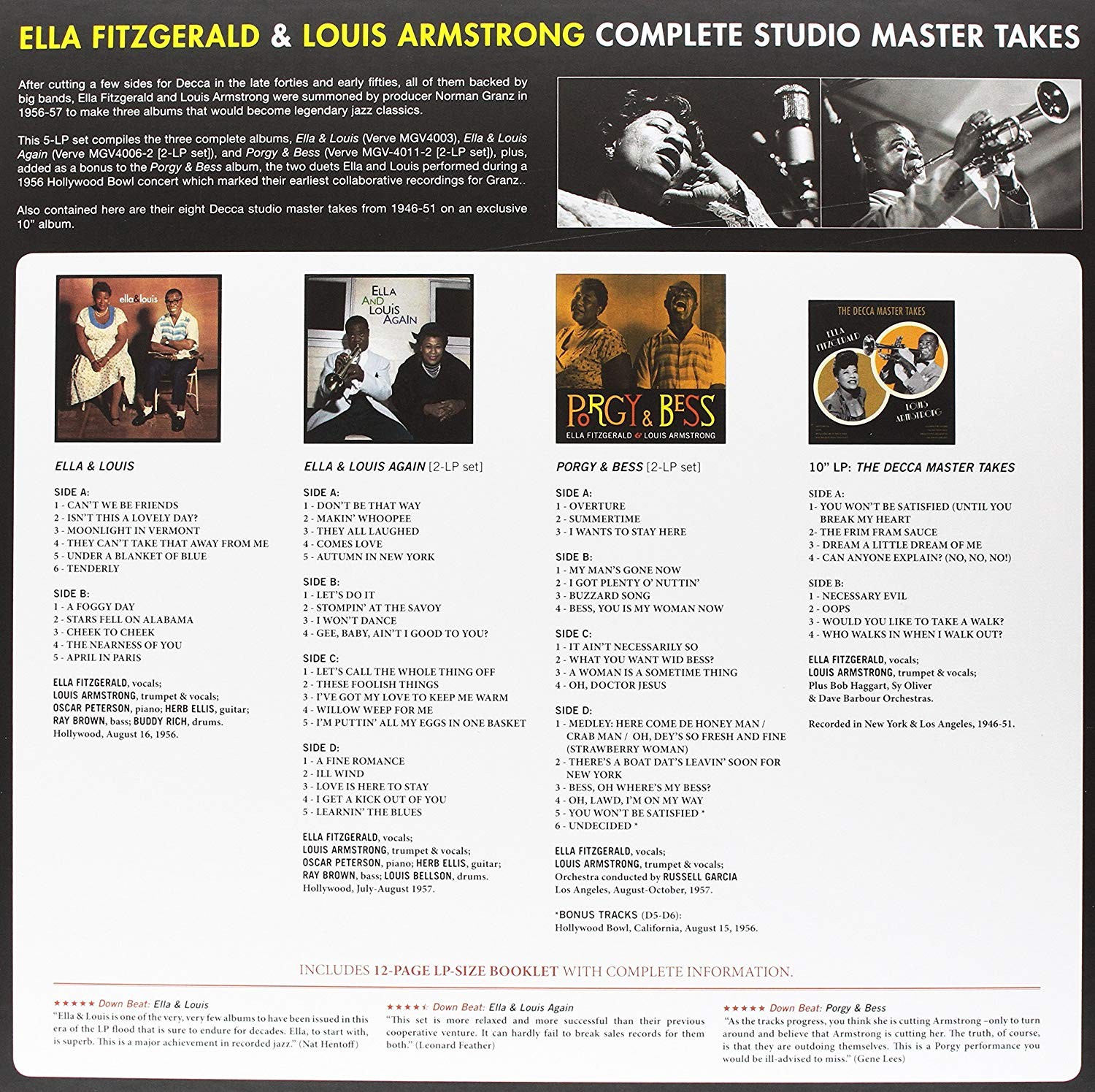 Este set de 5LP reúne los tres álbumes completos que ambos grabaron juntos, “Ella & Luis”, “Ella & Luis Again” y “Porgy & Bess” además de un extra en éste último con los dos duetos que ambos protagonizaron en el 56 durante en Hollywood Bowl concert. Incluye además un 10 pulgadas en color con las ocho tomas de Decca estudios grabados entre el 46 y el 51.