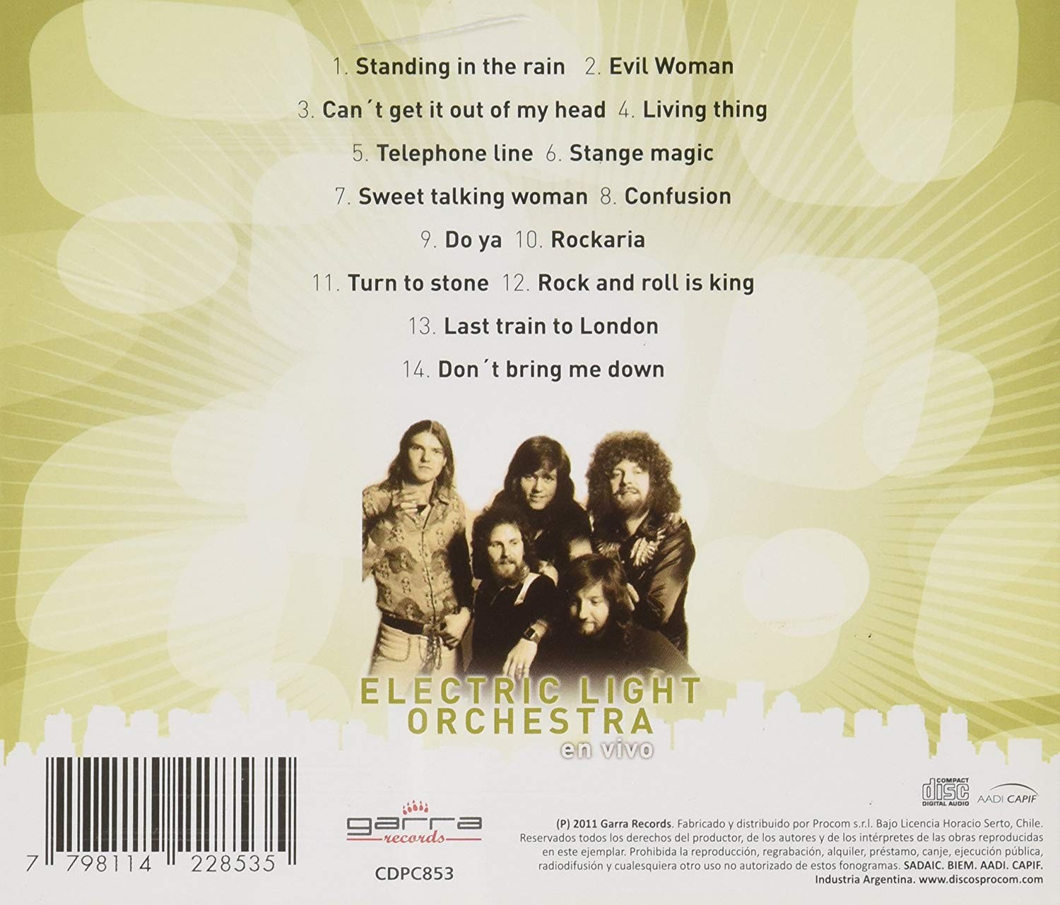 Artista(s) / Grupo: The Electric Light Orchestra | Cantidad de Discos: 1 | Lanzamiento: 2011 | Género(s): Rock | Estilo(s): Prog Rock | TÃtulo: Grandes Exitos en Vivo | Artista(s) / Grupo: The Electric Light Orchestra | Cantidad de Discos: 1 | Lanzamiento: 2011 | Género(s): Rock | Estilo(s): Prog Rock | TÃtulo: Grandes Exitos en Vivo