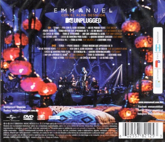 Artista(s) / Grupo: Emmanuel | Cantidad de Discos: 1 CD + 1 DVD | Lanzamiento: 2017 | Género(s): Pop | Estilo(s): Vocal, Ballad, Latin | TÃtulo: Con el Alma Desnuda – MTV Unplugged | Artista(s) / Grupo: Emmanuel | Cantidad de Discos: 1 CD + 1 DVD | Lanzamiento: 2017 | Género(s): Pop | Estilo(s): Vocal, Ballad, Latin | TÃtulo: Con el Alma Desnuda – MTV Unplugged