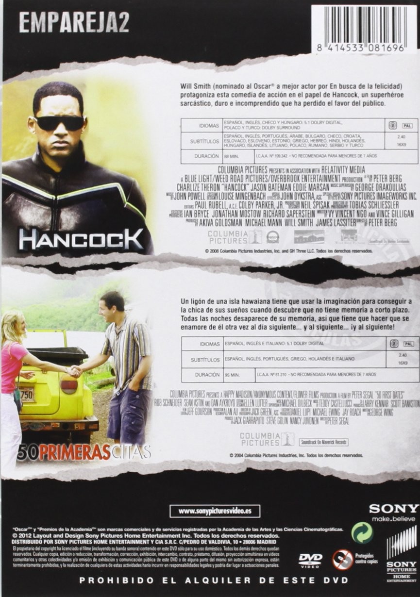 Cantidad de Discos: 2 | Lanzamiento: 2012 | Género(s): Comedia, Suspenso, Drama | Audio: Inglés, Francés, Español, Portugués, Alemán, Italiano | Subtítulos: Español, Francés, Checo, Húngaro, Polaco, Danés, Holandés, Finlandés, Noruego, Sueco, Inglés para Sordos, | Título: Empareja 2: Hancock (2008) / 50 primeras citas (2004) | Director(es): Peter Berg / Peter Segal | Reparto: Will Smith, Charlize Theron, Jason Bateman, Eddie Marsan, Jae Head, David Mattey, Maetrix Fitten, Thomas Lennon, Johnny Galecki, Hayley Marie Norman, Akiva Goldsman, Michael Mann, Brad Leland, Trieu Tran, Darrell Foster, Daeg Faerch/