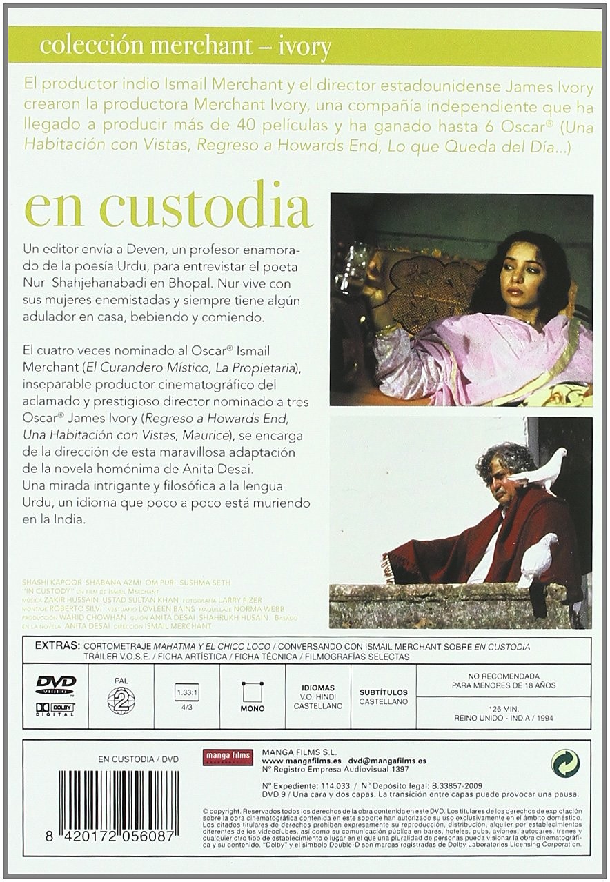 Cantidad de Discos: 1 | Lanzamiento: 1994 | Género(s): Comedia. Drama | Audio: Castellano, Hindi | Subtítulos: Castellano | Título: In Custody | Director(es): Ismail Merchant | Reparto: Shashi Kapoor, Shabana Azmi, Om Puri, Sushma Seth, Neena Gupta, Tinnu Anand, Prayag Raj, Parikshat Sahni, Sagar Arya, Veerendra Saxena, Afzal Khan, Amjad Khan | Norma / Región: PAL (Región 2) | Cantidad de Discos: 1 | Lanzamiento: 1994 | Género(s): Comedia. Drama | Audio: Castellano, Hindi | Subtítulos: Castellano | Título: In Custody | Director(es): Ismail Merchant | Reparto: Shashi Kapoor, Shabana Azmi, Om Puri, Sushma Seth, Neena Gupta, Tinnu Anand, Prayag Raj, Parikshat Sahni, Sagar Arya, Veerendra Saxena, Afzal Khan, Amjad Khan | Norma / Región: PAL (Región 2)