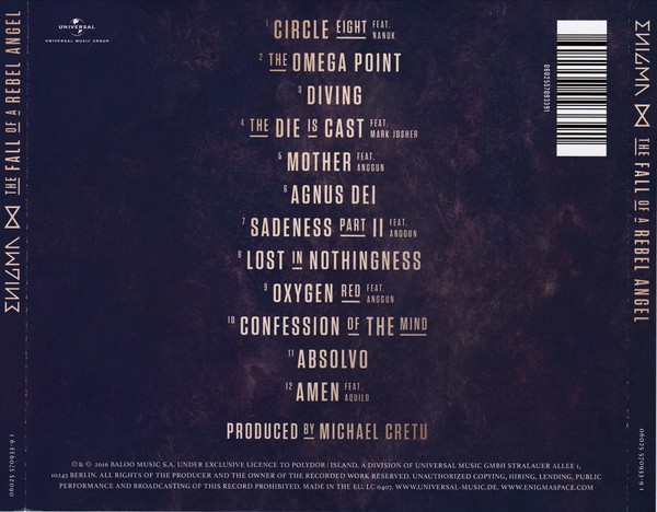 Artista(s) / Grupo: Enigma | Cantidad de Discos: 1 | Lanzamiento: 2016 | Género(s): Electronic. | Estilo(s): Ambient, New Age, Downtempo. | Título: The Fall Of A Rebel Angel | Artista(s) / Grupo: Enigma | Cantidad de Discos: 1 | Lanzamiento: 2016 | Género(s): Electronic. | Estilo(s): Ambient, New Age, Downtempo. | Título: The Fall Of A Rebel Angel