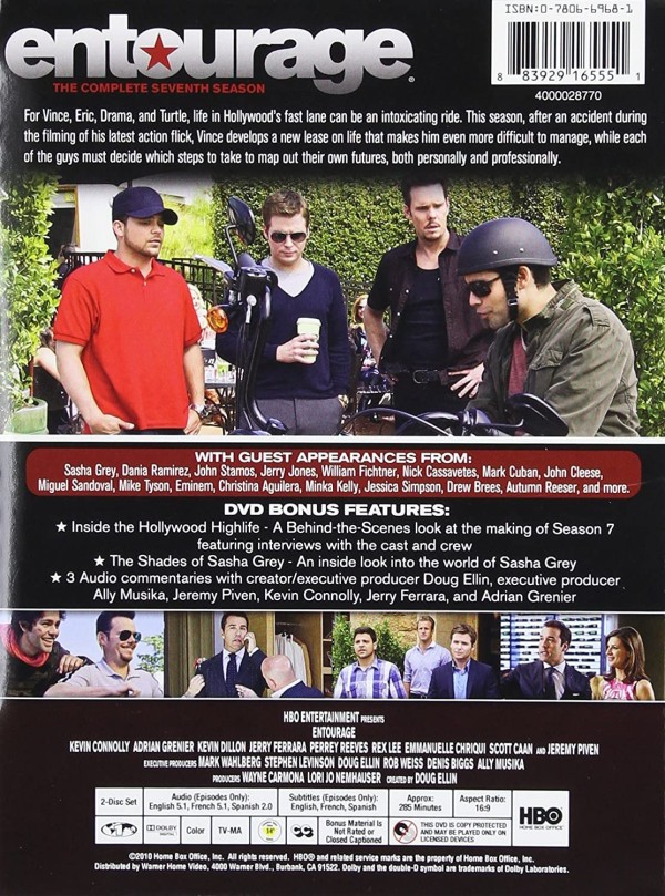 Cantidad de Discos: 2 | Lanzamiento: 2004 | Género(s): Serie de TV. Comedia. | Audio: Español, Inglés, Francés | SubtÃtulos: Español, Inglés, Francés | TÃtulo: Entourage – Temporada 7 | Director(es): Doug Ellin, Julian Farino, Mark Mylod, Daniel Attias, David Nutter, Ken Whittingham, Doug Ellin, Seith Mann, David Frankel, Patty Jenkins. | Reparto: Adrian Grenier, Kevin Connolly, Jerry Ferrara, Kevin Dillon, Jeremy Piven, Rex Lee, Debi Mazar, Perrey Reeves, Rhys Coiro, Beverly D’Angelo, Gary Cole, Emmanuelle Chriqui, Scott Caan, Carla Gugino, Malcolm McDowell, Nora Dunn, Melinda Clarke, Sasha Grey, Mandy Moore, Jami Gertz, Constance Zimmer, Kate Albrecht, Cassidy Lehrman, Jonathan Keltz, Jamie-Lynn Sigler, Monica Keena, Samaire Armstrong, Autumn Reeser, Eli Jane, Nicolette Nightingale, Dania Ramirez, Janet Montgomery, Alexis Dziena, Anna Faris, Kate Mara, Génesis Rodriguez, Alice Eve, Leighton Meester, Candice Patton, Edy Ganem, Lauren London. | Norma / Región: NTSC (Región A) | Cantidad de Discos: