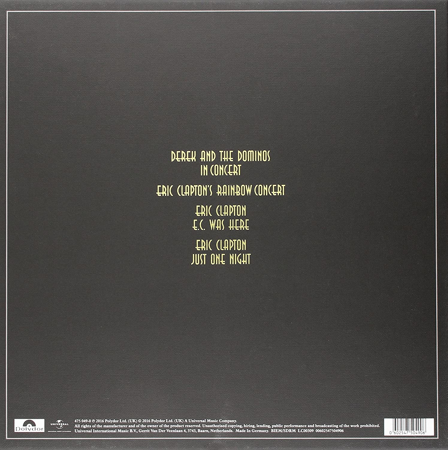 Artista(s) / Grupo: Eric Clapton | Cantidad de Discos: 6 LP | Lanzamiento: 2016 | Género(s): Rock Pop | TÃtulo: The Live Album Collection 1970-1980 | Artista(s) / Grupo: Eric Clapton | Cantidad de Discos: 6 LP | Lanzamiento: 2016 | Género(s): Rock Pop | TÃtulo: The Live Album Collection 1970-1980