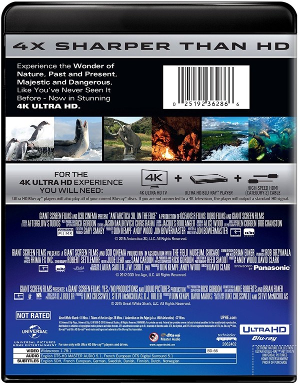 Tres impresionantes pelÃculas forman parte del Nature Pack, que ofrece la belleza natural más maravillosa del mundo de lugares remotos y prohibidos para la inmersiva experiencia 4K, que incluye Antarctica On the Edge, Titans of the Ice Age y Great White Shark. Narrado por Christopher Plummer (Actor), Tilda Swinton.