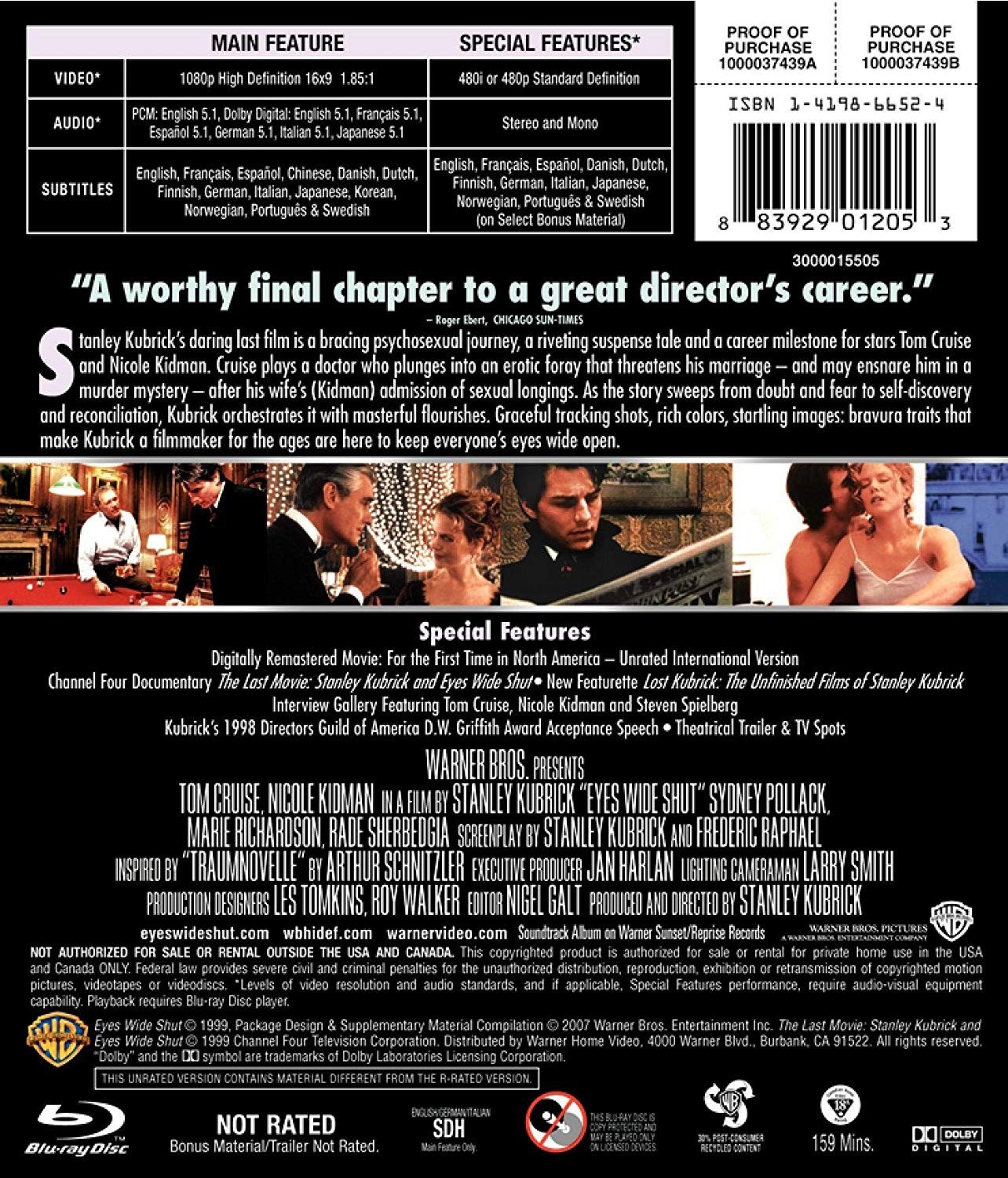 Reparto: Tom Cruise, Nicole Kidman, Sydney Pollack, Marie Richardson, Leelee Sobieski, Rade Serbedzija, Todd Field, Vinessa Shaw, Alan Cumming, Sky Dumont, Fay Masterson, Thomas Gibson, Madison Eginton, Louise J. Taylor, Stewart Thorndike, Jackie Sawiris, Peter Benson, Paul Randall, Julienne Davis, Lisa Leone, Mariana Hewett, Chris Pare, Christian Clark, Togo Igawa, Eiji Kusuhara, Sam Douglas, Angus MacInnes, Abigail Good, Brian W. Cook, Leon Vitali, Carmela Marner, Phil Davies, Cindy Dolenc, Treva Etienne, Dan Travers