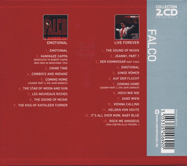 Artista(s) / Grupo: Falco | Cantidad de Discos: 2 | Lanzamiento: 2012 | Género(s): Electronic, Rock, Pop | Estilo(s): Synth-pop, Pop Rock | Título: 2 In 1: Emotional / Live Forever | Norma / Región: NTSC (Región 1, 4) | Artista(s) / Grupo: Falco | Cantidad de Discos: 2 | Lanzamiento: 2012 | Género(s): Electronic, Rock, Pop | Estilo(s): Synth-pop, Pop Rock | Título: 2 In 1: Emotional / Live Forever | Norma / Región: NTSC (Región 1, 4)