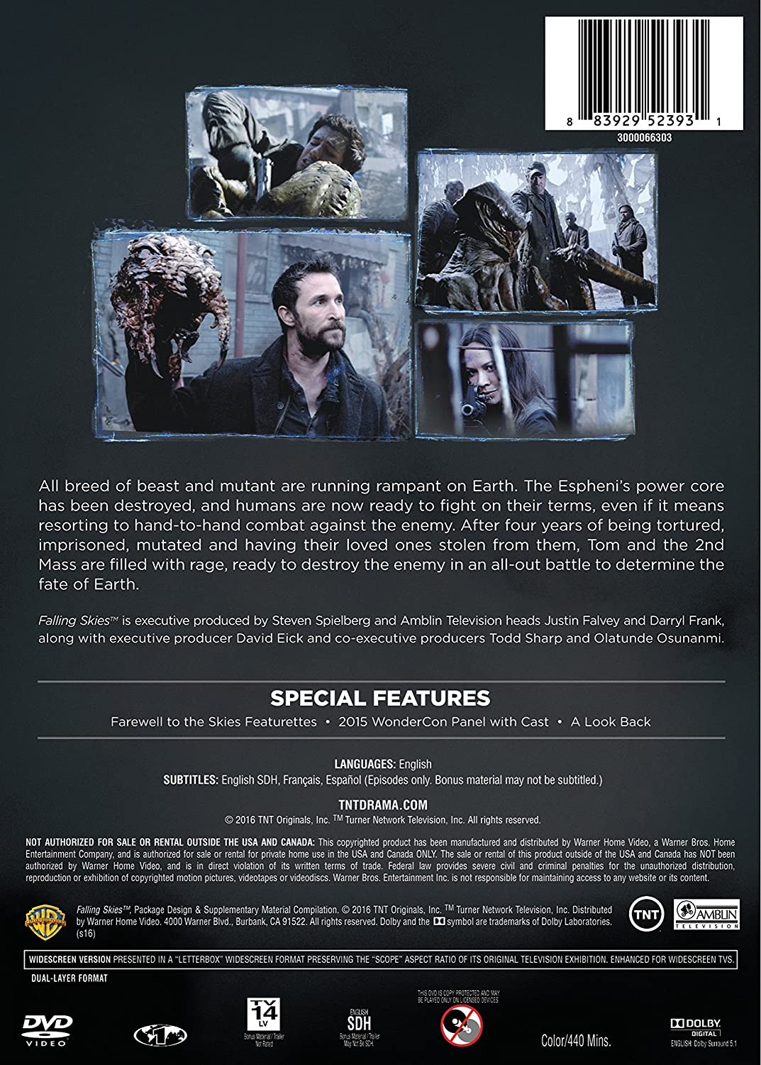 Cantidad de Discos: 2 | Lanzamiento: 2016 | Género(s): Serie de TV, Ciencia ficción, Drama | Audio: Inglés, Francés, Español | SubtÃtulos: Inglés, Francés, Español | TÃtulo: Falling Skies: The Complete Fifth Season | Director(es): Robert Rodat (Creator), Adam Kane, Greg Beeman, Sergio Mimica-Gezzan, David Solomon, Carl Franklin, Fred Toye, Holly Dale, Jonathan Frakes, Seith Mann | Reparto: Noah Wyle, Will Patton, Moon Bloodgood, Drew Roy, Connor Jessup, Seychelle Gabriel, Colin Cunningham, Sarah Carter, Maxim Knight, Peter Shinkoda, Mpho Koaho, Steven Weber, Henry Czerny, Ryan Robbins, Jessy Schram, Doug Jones, Brad Kelly, Laci J Mailey, Megan Danso, Scarlett Byrne, Mira Sorvino | Norma / Región: NTSC 1 | Cantidad de Discos: 2 | Lanzamiento: 2016 | Género(s): Serie de TV, Ciencia ficción, Drama | Audio: Inglés, Francés, Español | SubtÃtulos: Inglés, Francés, Español | TÃtulo: Falling Skies: The Complete Fifth Season | Director(es): Robert Rodat (Creator), Adam Kane, Greg Beeman, Sergio M