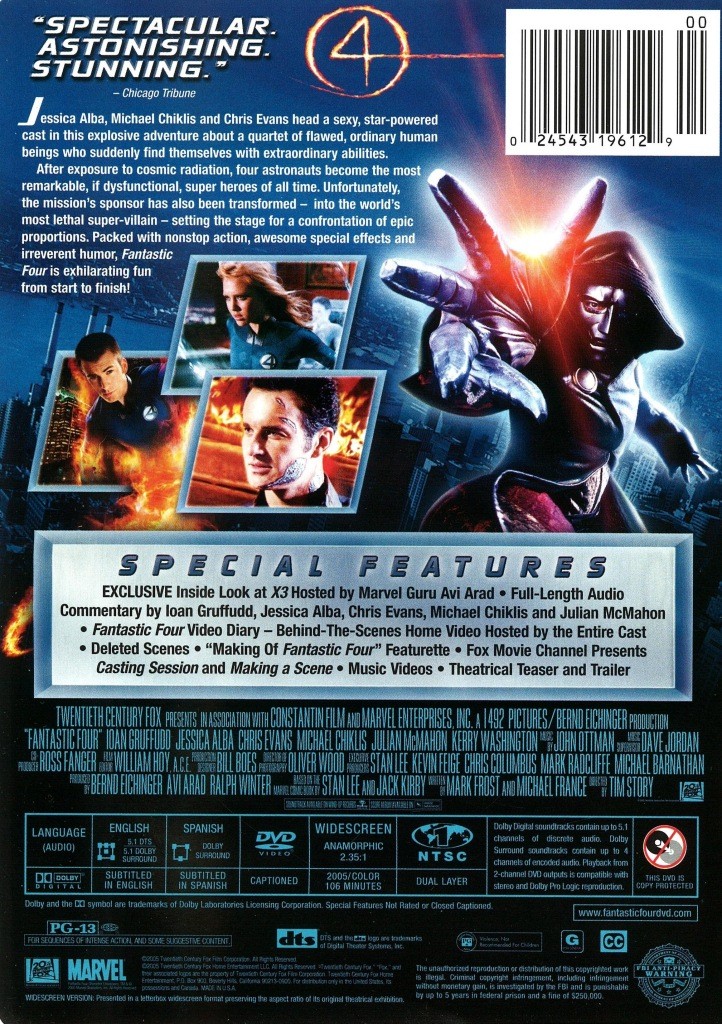 Cantidad de Discos: 1 | Lanzamiento: 2005 | Género(s): Fantástico, Acción, Ciencia ficción | Audio: Inglés, Español | SubtÃtulos: Inglés ,Español | TÃtulo: Los 4 fantásticos | Director(es): Tim Story | Reparto: Jessica Alba, Ioan Gruffudd, Michael Chiklis, Chris Evans, Julian McMahon, Kerry Washington, Stan Lee, Hamish Linklater, Laurie Holden, David Parker, Kevin McNulty, Maria Menounos, Michael Kopsa, Andrew Airlie, Pascale Hutton, G. Michael Gray, David Richmond-Peck, Penelope Corrin, Aonika Laurent | Sub-CategorÃas: Acción | Norma / Región: NTSC 1 | Cantidad de Discos: 1 | Lanzamiento: 2005 | Género(s): Fantástico, Acción, Ciencia ficción | Audio: Inglés, Español | SubtÃtulos: Inglés ,Español | TÃtulo: Los 4 fantásticos | Director(es): Tim Story | Reparto: Jessica Alba, Ioan Gruffudd, Michael Chiklis, Chris Evans, Julian McMahon, Kerry Washington, Stan Lee, Hamish Linklater, Laurie Holden, David Parker, Kevin McNulty, Maria Menounos, Michael Kopsa, Andr