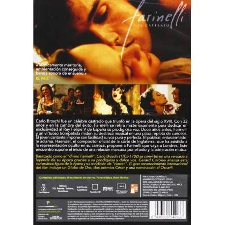 Cantidad de Discos: 1 | Lanzamiento: 2014 | Género(s): Drama, Romance, Histórico | Audio: Español, Inglés, Francés | SubtÃtulos: Español | TÃtulo: Farinelli – IL castrato (1994) | Director(es): Gérard Corbiau | Reparto: Stefano Dionisi, Elsa Zylberstein, Enrico Lo Verso, Caroline Cellier, Jeroen Krabbé, Omero Antonutti, Marianne Basler, Jacques Boudet | Sub-CategorÃas: Musical | Norma / Región: PAL (Región 2) | Cantidad de Discos: 1 | Lanzamiento: 2014 | Género(s): Drama, Romance, Histórico | Audio: Español, Inglés, Francés | SubtÃtulos: Español | TÃtulo: Farinelli – IL castrato (1994) | Director(es): Gérard Corbiau | Reparto: Stefano Dionisi, Elsa Zylberstein, Enrico Lo Verso, Caroline Cellier, Jeroen Krabbé, Omero Antonutti, Marianne Basler, Jacques Boudet | Sub-CategorÃas: Musical | Norma / Región: PAL (Región 2)
