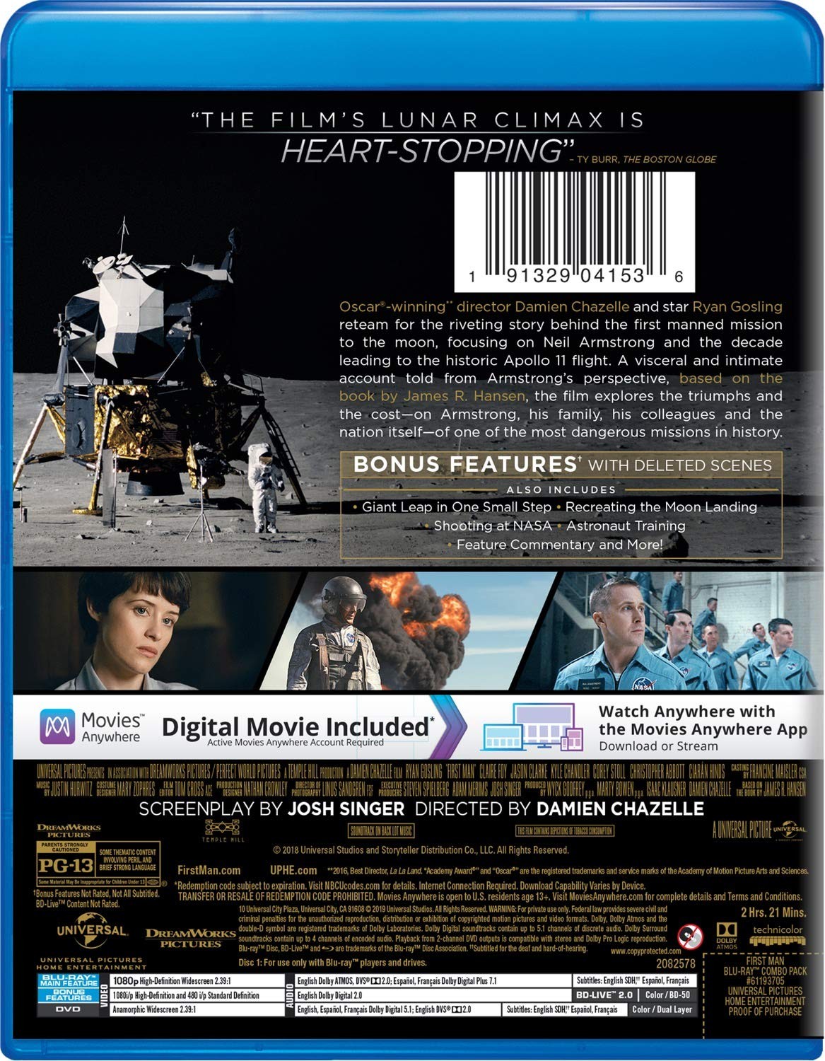 Cantidad de Discos: 1 BluRay + 1 DVD | Lanzamiento: 2018 | Género(s): Aventuras. Drama | Audio: Inglés (Dolby Digital 5,1), Español (Dolby Digital Stereo, Dolby Digital 5,1), Francés (Dolby Digital Stereo, Dolby Digital 5,1) | SubtÃtulos: Español, Inglés, Francés | TÃtulo: El primer hombre en la Luna | Director(es): Damien Chazelle | Reparto: Ryan Gosling, Jason Clarke, Claire Foy, Kyle Chandler, Corey Stoll, Patrick Fugit, Lukas Haas, Pablo Schreiber, Brian d’Arcy James, Ciarán Hinds, Aurelien Gaya, Ethan Embry, Shea Whigham, Christopher Abbott, Cory Michael Smith, Brady Smith, Perla Middleton, J.D. Evermore | Norma / Región: NTSC (Región A) | Cantidad de Discos: 1 BluRay + 1 DVD | Lanzamiento: 2018 | Género(s): Aventuras. Drama | Audio: Inglés (Dolby Digital 5,1), Español (Dolby Digital Stereo, Dolby Digital 5,1), Francés (Dolby Digital Stereo, Dolby Digital 5,1) | SubtÃtulos: Español, Inglés, Francés | TÃtulo: El primer hombre en la Luna | Director(es): Damien Chazelle | Reparto: Ryan