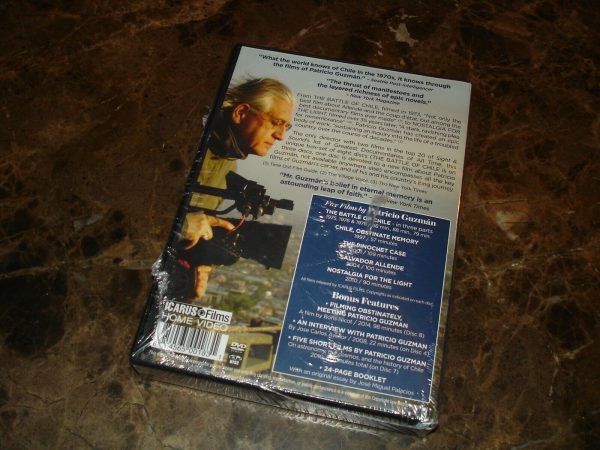 El box set de FIVE FILMS BY PATRICIO GUZMÁN ofrece una oportunidad extraordinaria de experimentar el trabajo de uno de los mejores documentalistas del mundo, el único director con dos películas en el top 20 de la lista de los mejores documentales de todos los tiempos de Sight & Sound. Primer estudio integral de la obra de Guzmán. Esta colección representa un lapso de 35 años de las películas de Guzmán. Incluye un largometraje sobre Guzmán, ¡no disponible en ningún otro lado! Incluye las obras más conocidas y elogiadas de Guzmán