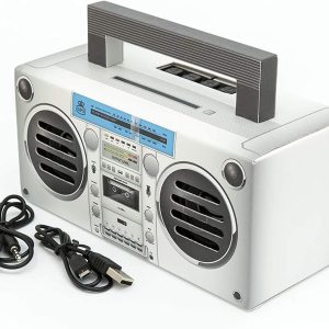 Acerca de este artículo Reproductor de CD de carga superior, compatible con A2DP, AVRCP, compatible con CD-R / RW, pantalla de pista de CD con LED azul Saltar / buscar, avanzar y retroceder, repetir 1 o todo, memoria programable Receptor FM estéreo, refuerzo de graves, conector para auriculares, asa de transporte incorporada Conector de entrada auxiliar para conectar su iPod, MP3 u otros reproductores de audio digital Alimentación: Adaptador de CA de 120 V (incluido) o 6 pilas «C» (UM-2) (no incluidas) Componentes incluidos: adaptador de CA, boombox