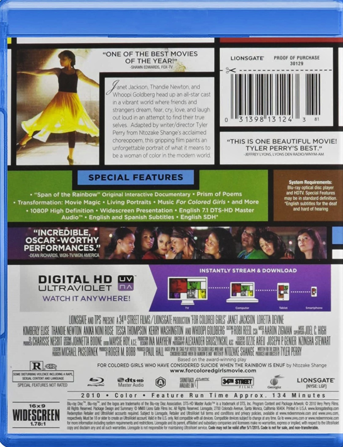 Cantidad de Discos: 1 Blu ray + 1 DVD | Lanzamiento: 2010 | Género(s): Drama | Audio: Inglés, Español | SubtÃtulos: Español, Inglés | TÃtulo: For Colored Girls | Director(es): Tyler Perry | Reparto: Whoopi Goldberg, Thandie Newton, Janet Jackson, Kerry Washington, Anika Noni Rose, Loretta Devine, Kimberly Elise, Richard Lawson, Macy Gray, Tessa Thompson, Phylicia Rashad, Hill Harper, Michael Ealy | Norma / Región: NTSC (Región A) | Cantidad de Discos: 1 Blu ray + 1 DVD | Lanzamiento: 2010 | Género(s): Drama | Audio: Inglés, Español | SubtÃtulos: Español, Inglés | TÃtulo: For Colored Girls | Director(es): Tyler Perry | Reparto: Whoopi Goldberg, Thandie Newton, Janet Jackson, Kerry Washington, Anika Noni Rose, Loretta Devine, Kimberly Elise, Richard Lawson, Macy Gray, Tessa Thompson, Phylicia Rashad, Hill Harper, Michael Ealy | Norma / Región: NTSC (Región A)