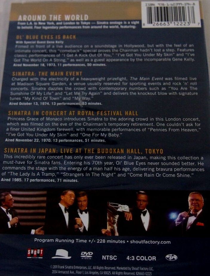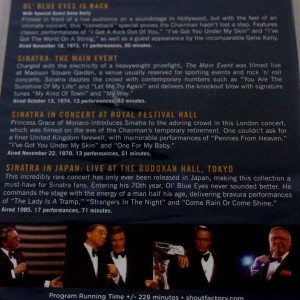 Durante los años 70 y 80, Francis Albert Sinatra presentó una serie de pelÃculas de conciertos populares, montadas, interpretadas y filmadas en lugares exóticos de todo el mundo; Cuatro de ellos aparecen en este extenso conjunto de cajas. El contenido incluye: Ol ‘Blue Eyes is Back de 1973 (con la estrella invitada especial Gene Kelley); Sinatra de 1974 : El Evento Principal ; Sinatra de 1970 en concierto en el Royal Festival Hall (presentado por la princesa Grace de Mónaco) y Sinatra de 1985 en Japón: en vivo en el Budokan Hall, Tokio .