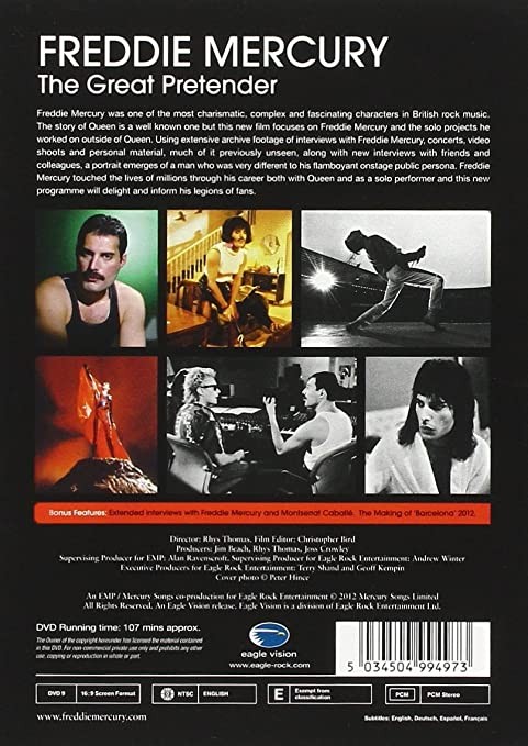 Artista(s) / Grupo: Freddie Mercury | Cantidad de Discos: 1 | Lanzamiento: 2012 | Género(s): Documental, Musical | Estilo(s): Rock, Non-Music, Pop | Título: The Great Pretender | Norma / Región: NTSC 1 | Artista(s) / Grupo: Freddie Mercury | Cantidad de Discos: 1 | Lanzamiento: 2012 | Género(s): Documental, Musical | Estilo(s): Rock, Non-Music, Pop | Título: The Great Pretender | Norma / Región: NTSC 1