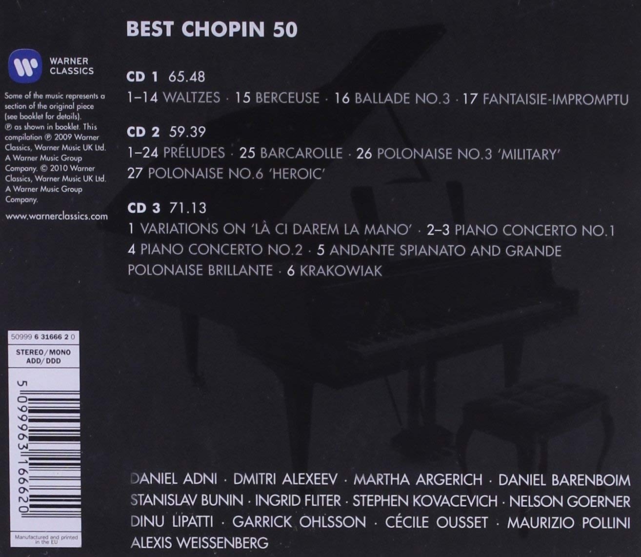 Artista(s) / Grupo: Frédéric Chopin | Cantidad de Discos: 3 | Lanzamiento: 2010 | Género(s): Clásica | TÃtulo: Best Chopin 50 | Artista(s) / Grupo: Frédéric Chopin | Cantidad de Discos: 3 | Lanzamiento: 2010 | Género(s): Clásica | TÃtulo: Best Chopin 50