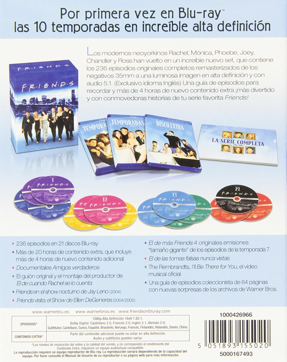 Director(es): David Crane (Creator), Marta Kauffman (Creator), Gary Halvorson, Kevin Bright, Michael Lembeck, James Burrows, Gail Mancuso, Peter Bonerz, David Schwimmer, Ben Weiss, Robby Benson, Shelley Jensen, Terry Hughes, Dana De Vally Piazza, Sheldon Epps, Pamela Fryman, Alan Myerson, Thomas Schlamme, Steve Zuckerman, Roger Christiansen, Paul Lazarus, Ellen Falcon, Sam Simon, Arlene Sanford, Joe Regalbuto, Todd Holland, Stephen Prime, Andrew Tsao, David Steinberg, Mary Kay Place | Reparto: Jennifer Aniston, Courteney Cox, Lisa Kudrow, Matt LeBlanc, Matthew Perry, David Schwimmer, James Michael Tyler, Elliott Gould, Paul Rudd, Giovanni Ribisi, Tom Selleck, Hank Azaria, Bruce Willis, Michael Rapaport, Christina Pickles