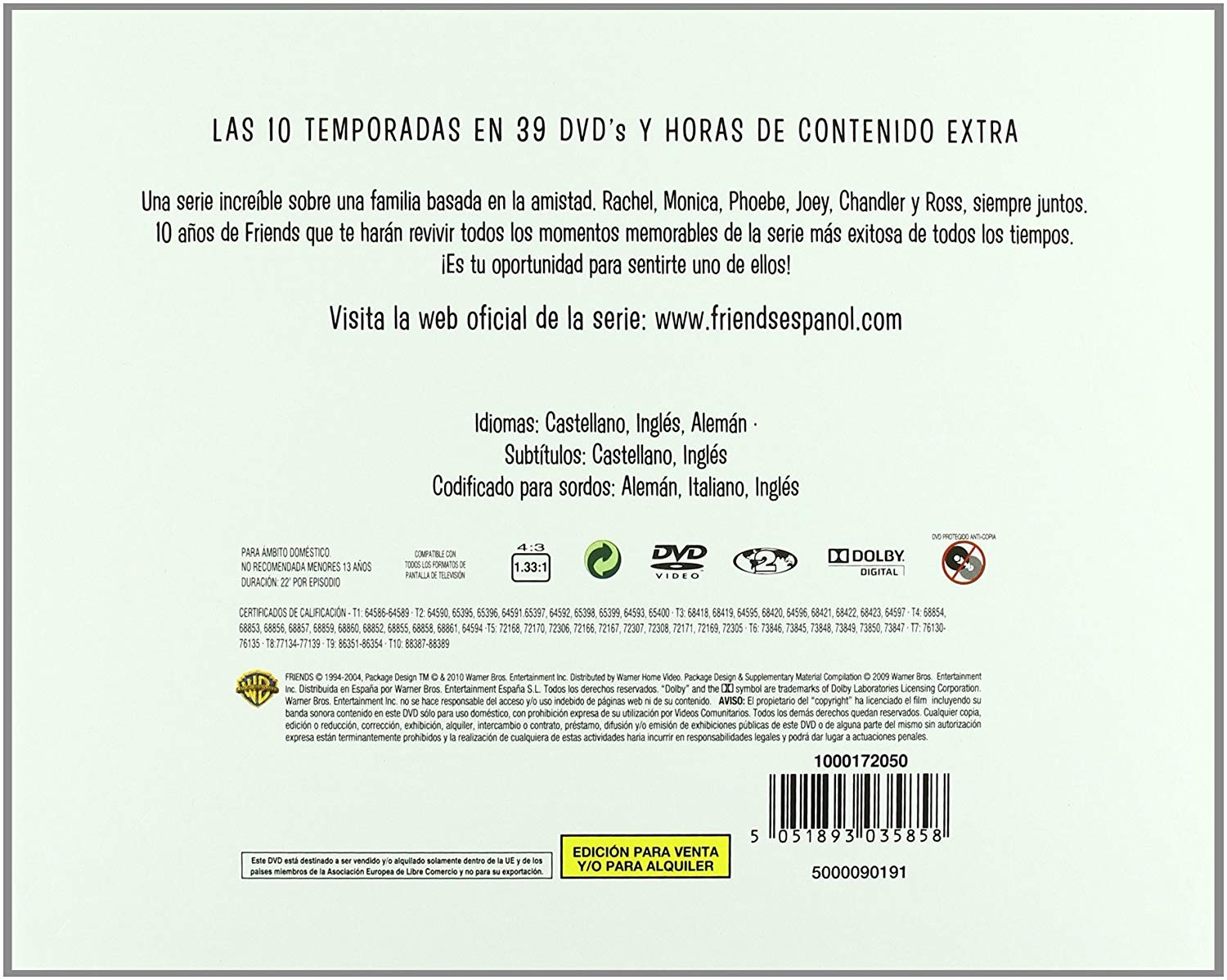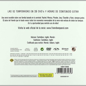 Cantidad de Discos: 39 DVD | Lanzamiento: 2010 | Género(s): Serie de TV, Comedia | Audio: Inglés, Español, Alemán | SubtÃtulos: Inglés, Alemán, Francés | TÃtulo: Amigos (1994) | Director(es): David Crane (Creator), Marta Kauffman (Creator), Gary Halvorson, Kevin Bright, Michael Lembeck, James Burrows, Gail Mancuso, Peter Bonerz, David Schwimmer, Ben Weiss, Robby Benson, Shelley Jensen, Terry Hughes, Dana De Vally Piazza, Sheldon Epps, Pamela Fryman, Alan Myerson, Thomas Schlamme, Steve Zuckerman, Roger Christiansen, Paul Lazarus, Ellen Gittelsohn, Sam Simon, Arlene Sanford, Joe Regalbuto, Todd Holland, Stephen Prime, Andrew Tsao, David Steinberg, Mary Kay Place | Reparto: Jennifer Aniston, Courteney Cox, Lisa Kudrow, Matt LeBlanc, Matthew Perry, David Schwimmer, James Michael Tyler, Elliott Gould, Paul Rudd, Giovanni Ribisi, Tom Selleck, Hank Azaria, Bruce Willis, Michael Rapaport, Christina Pickles, Maggie Wheeler, Jane Sibbett, Helen Baxendale, Jessica Hecht, June Gable, Jon Favreau, Elle MacPherso