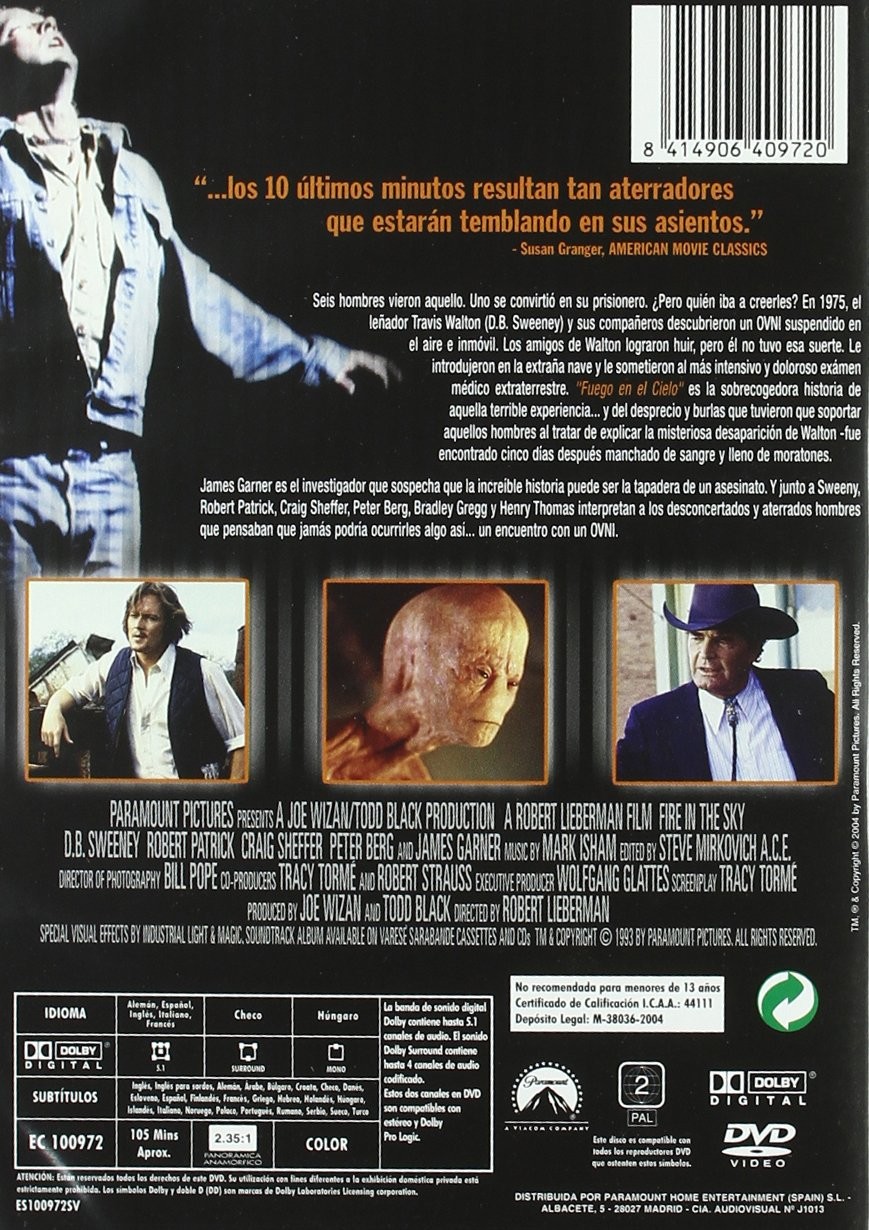Cantidad de Discos: 1 | Lanzamiento: 1993 | Género(s): Ciencia ficción | Audio: Italiano (Dolby Digital 5.1), Alemán (Dolby Digital 5.1), Inglés (Dolby Digital 5.1), Francés (Dolby Digital 5.1), Castellano (Dolby Digital 5.1) | Subtítulos: Inglés, Alemán, Árabe, Búlgaro, Croata, Checo, Danés, Eslavo, Castellano, Finlandés, Francés, Griego, Hebreo, Holandés, Húngaro, Sueco, Noruego, Polaco, Rumano | Título: Fire in the Sky | Director(es): Robert Lieberman | Reparto: Craig Sheffer, D.B. Sweeney, Henry Thomas, James Garner, Kathleen Wilhoite, Robert Patrick, Bradley Gregg, Noble Willingham, Peter Berg | Norma / Región: PAL (Región 2) | Cantidad de Discos: 1 | Lanzamiento: 1993 | Género(s): Ciencia ficción | Audio: Italiano (Dolby Digital 5.1), Alemán (Dolby Digital 5.1), Inglés (Dolby Digital 5.1), Francés (Dolby Digital 5.1), Castellano (Dolby Digital 5.1) | Subtítulos: Inglés, Alemán, Árabe, Búlgaro, Croata, Checo, Danés, Eslavo, Castellano, Finlandés, Francés, Griego, Heb