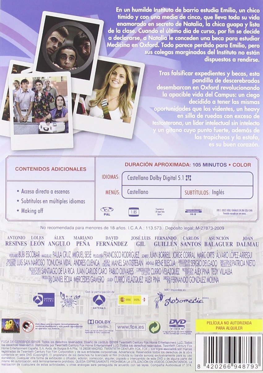 Cantidad de Discos: 1 | Lanzamiento: 2009 | Género(s): Comedia | Audio: Español | Subtítulos: Inglés | Título: Fuga de Cerebros | Director(es): Fernando Gonzalez Molina | Reparto: Mario Casas, Alberto Amarilla, Canco Rodriguez, Gorka Lasaosa, Amaia Salamanca | Norma / Región: PAL (Región 2) | Cantidad de Discos: 1 | Lanzamiento: 2009 | Género(s): Comedia | Audio: Español | Subtítulos: Inglés | Título: Fuga de Cerebros | Director(es): Fernando Gonzalez Molina | Reparto: Mario Casas, Alberto Amarilla, Canco Rodriguez, Gorka Lasaosa, Amaia Salamanca | Norma / Región: PAL (Región 2)