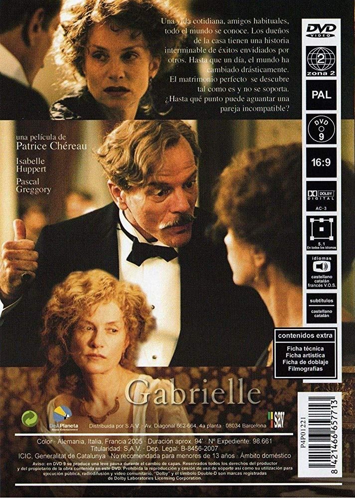 Cantidad de Discos: 1 | Lanzamiento: 2005 | Género(s): Drama | Audio: Español, Catalán, Francés | SubtÃtulos: Español, Catalán | TÃtulo: Gabrielle | Director(es): Patrice Chéreau | Reparto: Isabelle Huppert, Pascal Greggory, Clement Hervieu-Leger, Louise Vincent, Thierry Fortineau, Chantal Neuwirth | Norma / Región: PAL (Región 2) | Cantidad de Discos: 1 | Lanzamiento: 2005 | Género(s): Drama | Audio: Español, Catalán, Francés | SubtÃtulos: Español, Catalán | TÃtulo: Gabrielle | Director(es): Patrice Chéreau | Reparto: Isabelle Huppert, Pascal Greggory, Clement Hervieu-Leger, Louise Vincent, Thierry Fortineau, Chantal Neuwirth | Norma / Región: PAL (Región 2)