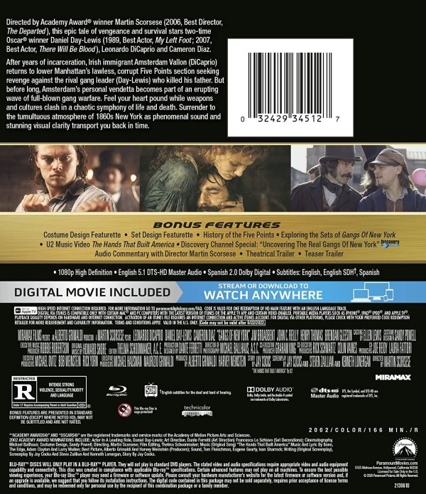 Reparto: Daniel Day-Lewis, Leonardo DiCaprio, Cameron Diaz, Jim Broadbent, John C. Reilly, Henry Thomas, Brendan Gleeson, Liam Neeson, Stephen Graham, Gary Lewis, Cara Seymour, David Hemmings, Larry Gilliard Jr., Eddie Marsan, Alec McCowen, Roger Ashton-Griffiths, Michael Byrne, John Sessions, Lucy Davenport, Barbara Bouchet