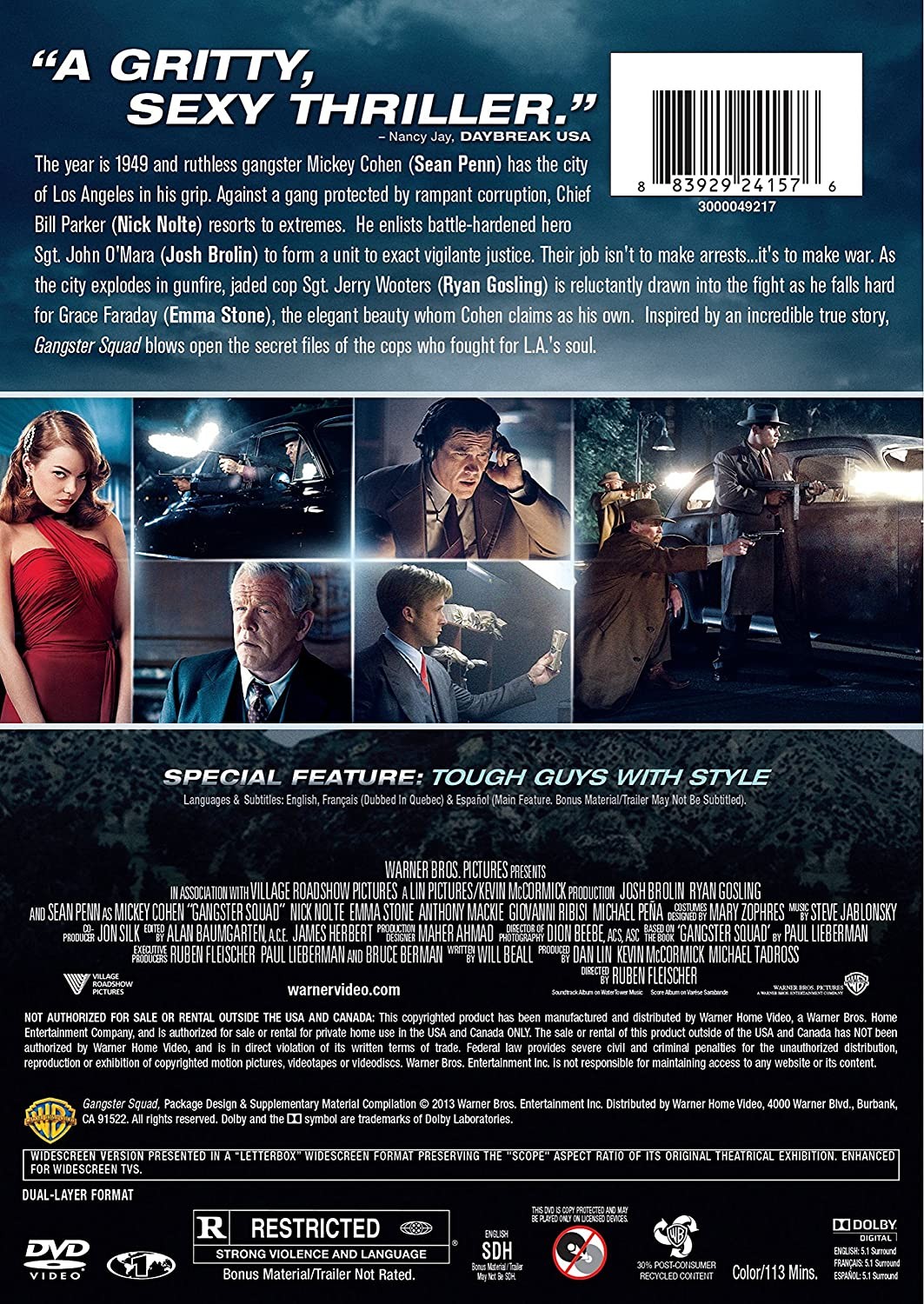 Cantidad de Discos: 1 | Lanzamiento: 2013 | Género(s): Cine negro, Policiaco | Audio: Inglés, Francés, Español | Subtítulos: Español, Inglés, Francés | Título: Gangster Squad | Director(es): Ruben Fleischer | Reparto: Josh Brolin, Sean Penn, Ryan Gosling, Emma Stone, Robert Patrick, Michael Peña, Giovanni Ribisi, Anthony Mackie, Nick Nolte, Mireille Enos, Holt McCallany, Wade Williams, James Landry Hébert, Ambyr Childers, Jeff Wolfe, Jack McGee, Derek Mears, Derek Graf | Norma / Región: NTSC 1 | Cantidad de Discos: 1 | Lanzamiento: 2013 | Género(s): Cine negro, Policiaco | Audio: Inglés, Francés, Español | Subtítulos: Español, Inglés, Francés | Título: Gangster Squad | Director(es): Ruben Fleischer | Reparto: Josh Brolin, Sean Penn, Ryan Gosling, Emma Stone, Robert Patrick, Michael Peña, Giovanni Ribisi, Anthony Mackie, Nick Nolte, Mireille Enos, Holt McCallany, Wade Williams, James Landry Hébert, Ambyr Childers, Jeff Wolfe, Jack McGee, Derek Mears, Derek Graf | Norma / Región: NTSC 1