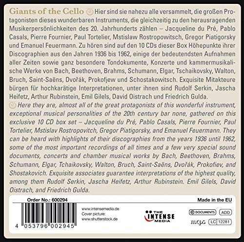 Esta caja de 10 CD contiene algunos de los mejores violonchelistas clásicos del mundo: Jacqueline du Pré, Pablo Casals, Mstislav Rostropovich, Pierre Fournier, Paul Tortelier, Gregor Piatigorsky y Emanuel Feuermann. Estas interpretaciones de clase alta incluyen algunas de las grabaciones más significativas de todos los tiempos. El set cuenta con artistas acompañantes del más alto nivel, incluidos Friedrich Gulda, Rudolf Serkin, Jascha Heifetz, Arthur Rubinstein y otros. Interpretan conciertos y música de cámara de Bach, Beethoven, Brahms, Tchaikovsky, Walton, Bruch y otros.
