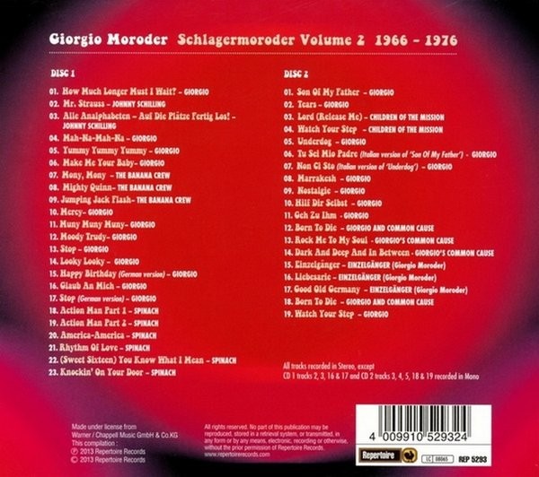 Artista(s) / Grupo: Giorgio Moroder | Cantidad de Discos: 2 | Lanzamiento: 2013 | Género(s): Electronic, Rock, Pop | Estilo(s): Psychedelic Rock, Experimental, Beat, Bubblegum | TÃtulo: Schlagermoroder Volume 2 1965 – 1976 | Artista(s) / Grupo: Giorgio Moroder | Cantidad de Discos: 2 | Lanzamiento: 2013 | Género(s): Electronic, Rock, Pop | Estilo(s): Psychedelic Rock, Experimental, Beat, Bubblegum | TÃtulo: Schlagermoroder Volume 2 1965 – 1976