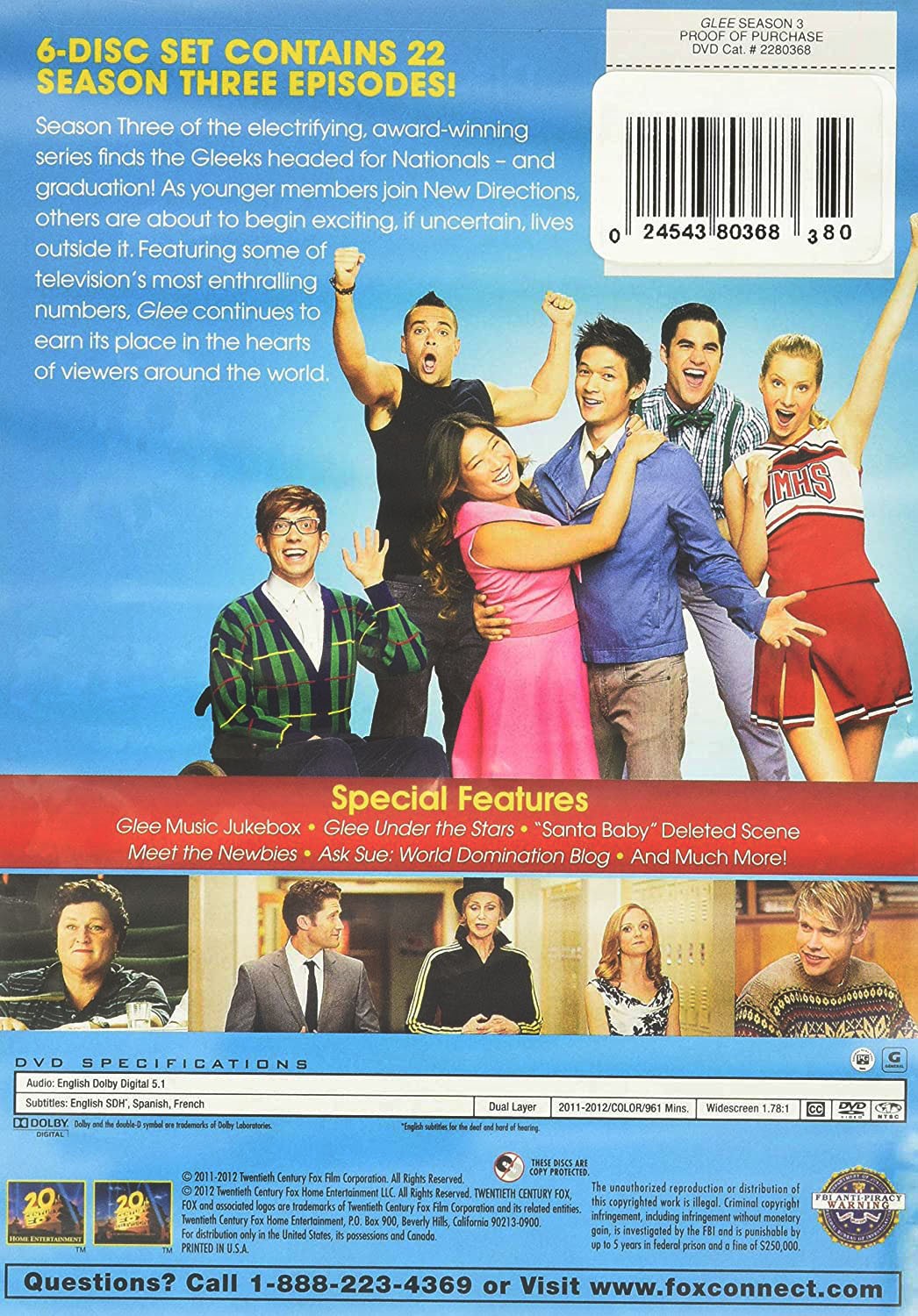 Cantidad de Discos: 6 | Lanzamiento: 2009 | Género(s): Serie de TV. Comedia. Musical. | Audio: Español, Inglés, Francés | Subtítulos: Español, Inglés, Francés | Título: Glee – Temporada 3 | Director(es): Ryan Murphy, Brad Falchuk, Ian Brennan, Brad Falchuk, Ryan Murphy, Alfonso Gomez-Rejon, Eric Stoltz, Bradley Buecker. | Reparto: Lea Michele, Cory Monteith, Dianna Agron, Chris Colfer, Jessalyn Gilsig, Jayma Mays, Kevin McHale, Matthew Morrison, Amber Riley, Mark Salling, Jenna Ushkowitz, Jane Lynch, Naya Rivera, Iqbal Theba, Harry Shum Jr., Chord Overstreet, Idina Menzel, Samuel Larsen, Damian McGinty, Lindsay Pearce, Alex Newell, Blake Jenner, Demi Lovato, Heather Morris, Darren Criss, Noah Guthrie, Jake Zyrus, Adam Lambert, Samantha Marie Ware, Grant Gustin. | Norma / Región: NTSC (Región A) | Cantidad de Discos: 6 | Lanzamiento: 2009 | Género(s): Serie de TV. Comedia. Musical. | Audio: Español, Inglés, Francés | Subtítulos: Español, Inglés, Francés | Título: Glee – Temporada 3 | Direct