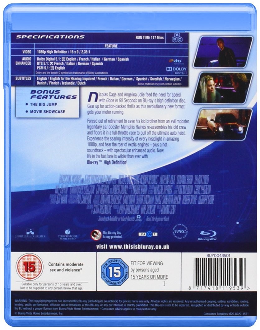 Cantidad de Discos: 1 | Lanzamiento: 2000 | Género(s): Acción | Audio: Inglés (Dolby Digital 5,1) | SubtÃtulos: Español, Inglés, Francés | TÃtulo: 60 segundos | Director(es): Dominic Sena | Reparto: Nicolas Cage, Angelina Jolie, Giovanni Ribisi, Robert Duvall, Delroy Lindo, Will Patton, Christopher Eccleston, Chi McBride, Vinnie Jones, Grace Zabriskie, Bodhi Elfman, Arye Gross, Carmen Argenziano, John Carroll Lynch, Master P, Timothy Olyphant | Sub-CategorÃas: Acción | Norma / Región: NTSC (Región A) | Cantidad de Discos: 1 | Lanzamiento: 2000 | Género(s): Acción | Audio: Inglés (Dolby Digital 5,1) | SubtÃtulos: Español, Inglés, Francés | TÃtulo: 60 segundos | Director(es): Dominic Sena | Reparto: Nicolas Cage, Angelina Jolie, Giovanni Ribisi, Robert Duvall, Delroy Lindo, Will Patton, Christopher Eccleston, Chi McBride, Vinnie Jones, Grace Zabriskie, Bodhi Elfman, Arye Gross, Carmen Argenziano, John Carroll Lynch, Master P, Timothy Olyphant | Sub-CategorÃas: Acción | Norma / Región: NTS