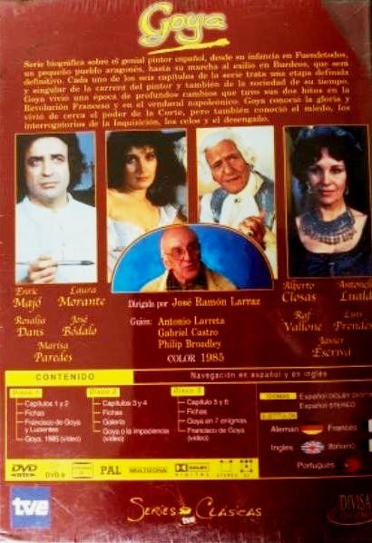 Cantidad de Discos: 3 | Lanzamiento: 2012 | Género(s): Serie de TV, Drama | Audio: Español (Dolby Digital 5,1) | SubtÃtulos: Alemán, Francés, Inglés, Italiano, Portugués | TÃtulo: Goya (1985) – Serie Completa | Director(es): José Ramón Larraz | Reparto: Enric Majó, Laura Morante, Raf Vallone, José Bódalo, RosalÃa Dans, Antonella Lualdi, Jeannine Mestre, Luis Escobar, Carlos Larrañaga, Juanjo Puigcorbé | Norma / Región: PAL (Región 2) | Cantidad de Discos: 3 | Lanzamiento: 2012 | Género(s): Serie de TV, Drama | Audio: Español (Dolby Digital 5,1) | SubtÃtulos: Alemán, Francés, Inglés, Italiano, Portugués | TÃtulo: Goya (1985) – Serie Completa | Director(es): José Ramón Larraz | Reparto: Enric Majó, Laura Morante, Raf Vallone, José Bódalo, RosalÃa Dans, Antonella Lualdi, Jeannine Mestre, Luis Escobar, Carlos Larrañaga, Juanjo Puigcorbé | Norma / Región: PAL (Región 2)