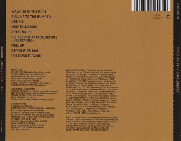 Artista(s) / Grupo: Grace Jones | Cantidad de Discos: 1 | Lanzamiento: 2015 | Género(s): Electronic, Funk / Soul | Estilo(s): Dub, Downtempo, Synth-pop, Disco | TÃtulo: Nightclubbing | Norma / Región: NTSC (Región 1, 4) | Artista(s) / Grupo: Grace Jones | Cantidad de Discos: 1 | Lanzamiento: 2015 | Género(s): Electronic, Funk / Soul | Estilo(s): Dub, Downtempo, Synth-pop, Disco | TÃtulo: Nightclubbing | Norma / Región: NTSC (Región 1, 4) | Artista(s) / Grupo: Grace Jones | Cantidad de Discos: 1 | Lanzamiento: 2015 | Género(s): Electronic, Funk / Soul | Estilo(s): Dub, Downtempo, Synth-pop, Disco | TÃtulo: Nightclubbing | Norma / Región: NTSC (Región 1, 4)