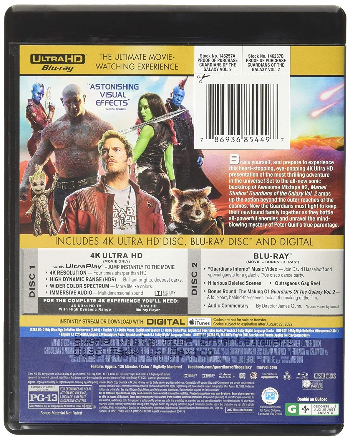 Cantidad de Discos: 1 4K + 1 Bluray | Lanzamiento: 2017 | Género(s): Acción, Ciencia Ficción | Audio: Inglés, Español, Francés | SubtÃtulos: Español, Inglés, Francés | TÃtulo: Guardians of the Galaxy Vol. 2 | Director(es): James Gunn | Reparto: Chris Pratt, Zoe Saldana, Dave Bautista, Bradley Cooper, Vin Diesel, Kurt Russell, Michael Rooker, Karen Gillan, Elizabeth Debicki, Tommy Flanagan, Sean Gunn, Pom Klementieff, Chris Sullivan, Sylvester Stallone, Stan Lee, Ving Rhames | Norma / Región: NTSC (Región A) | Cantidad de Discos: 1 4K + 1 Bluray | Lanzamiento: 2017 | Género(s): Acción, Ciencia Ficción | Audio: Inglés, Español, Francés | SubtÃtulos: Español, Inglés, Francés | TÃtulo: Guardians of the Galaxy Vol. 2 | Director(es): James Gunn | Reparto: Chris Pratt, Zoe Saldana, Dave Bautista, Bradley Cooper, Vin Diesel, Kurt Russell, Michael Rooker, Karen Gillan, Elizabeth Debicki, Tommy Flanagan, Sean Gunn, Pom Klementieff, Chris Sullivan, Sylvester Stallone, Stan Lee, Ving Rhames | No