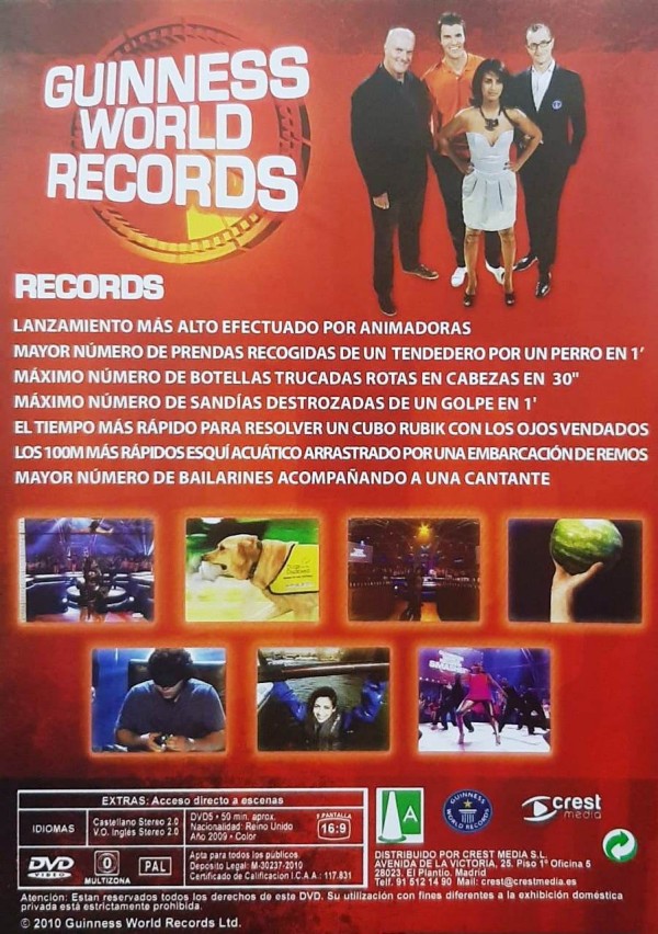 Cantidad de Discos: 1 | Lanzamiento: 2009 | Género(s): Documental | Audio: Español (Dolby Digital 2.0), Inglés (Dolby Digital 2.0) | TÃtulo: Guinness world records 3 | Norma / Región: PAL Multizona | Series: Crest media | Cantidad de Discos: 1 | Lanzamiento: 2009 | Género(s): Documental | Audio: Español (Dolby Digital 2.0), Inglés (Dolby Digital 2.0) | TÃtulo: Guinness world records 3 | Norma / Región: PAL Multizona | Series: Crest media