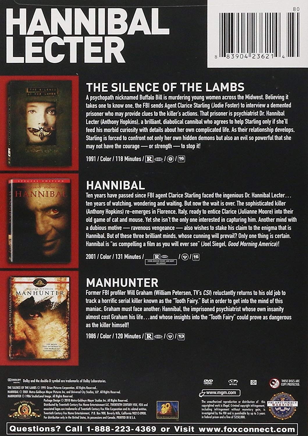 Cantidad de Discos: 3 | Lanzamiento: 1991 / 2001/ 1986 | Género(s): Thriller. Intriga | Audio: Inglés | SubtÃtulos: Francés, Español, Inglés | TÃtulo: El silencio de los inocentes / Hannibal / Manhunter | Director(es): Jonathan Demme / Ridley Scott /Michael Mann | Reparto: Jodie Foster, Anthony Hopkins, Scott Glenn, Ted Levine, Anthony Heald, Diane Baker, Brooke Smith, Tracey Walter, Kasi Lemmons, Chris Isaak, Charles Napier, Roger Corman, Frankie Faison, Paul Lazar, Daniel Von Bargen, Cynthia Ettinger.