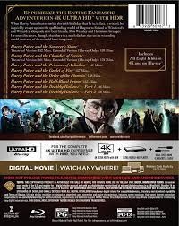 Cantidad de Discos: 8 4K + 8 BluRay | Lanzamiento: 2017 | Género(s): Aventura, Ciencia Ficción, Fantástico | Audio: Inglés (Dolby Digital 5,1), Español (Dolby Digital Stereo, Dolby Digital 5,1), Francés (Dolby Digital Stereo, Dolby Digital 5,1) | SubtÃtulos: Español, Inglés, Francés | TÃtulo: Harry Potter – 8 Film Collection: Harry Potter y la Piedra filosofal / Harry Potter y la Cámara secreta / Harry Potter y el prisionero de Azkaban / Harry Potter y el Cáliz de fuego / Harry Potter y la Orden de Fénix / Harry Potter y el misterio del Principa / Harry Potter y las Reliquias de la mueret – Parte 1 / Harry Potter y las Reliquias de la mueret – Parte 2 | Director(es): Chris Columbus, Alfonso Cuarón, Mike Newell, David Yates | Reparto: Daniel Radcliffe, Emma Watson, Rupert Grint, Alan Rickman, Ralph Fiennes, Helena Bonham Carter, Michael Gambon, Jason Isaacs, Maggie Smith, David Thewlis, Julie Walters, Robbie Coltrane, Gary Oldman, Kelly Macdonald, Helen McCrory, John Hurt, Natalia Tena, Ciarán