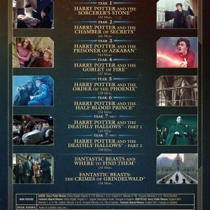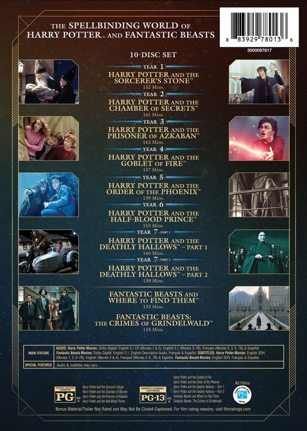 Reparto: Daniel Radcliffe, Rupert Grint, Emma Watson, Robbie Coltrane, Richard Harris, Maggie Smith, Alan Rickman, Richard Griffiths, Tom Felton, Ian Hart, John Hurt, Harry Melling, John Cleese, Matthew Lewis, Warwick Davis, David Bradley, Fiona Shaw, Sean Biggerstaff, Devon Murray, Alfred Enoch, Zoe Wanamaker, James Phelps, Oliver Phelps, Julie Walters, Eddie Redmayne, Dan Fogler, Katherine Waterston, Alison Sudol, Colin Farrell, Carmen Ejogo, Ezra Miller, Samantha Morton, Ron Perlman, Jon Voight, Ronan Raftery, Josh Cowdery, Jenn Murray, Johnny Depp, Zöe Kravitz, Faith Wood-Blagrove, Kevin Guthrie, Martin Oelbermann, Brian F. Mulvey //