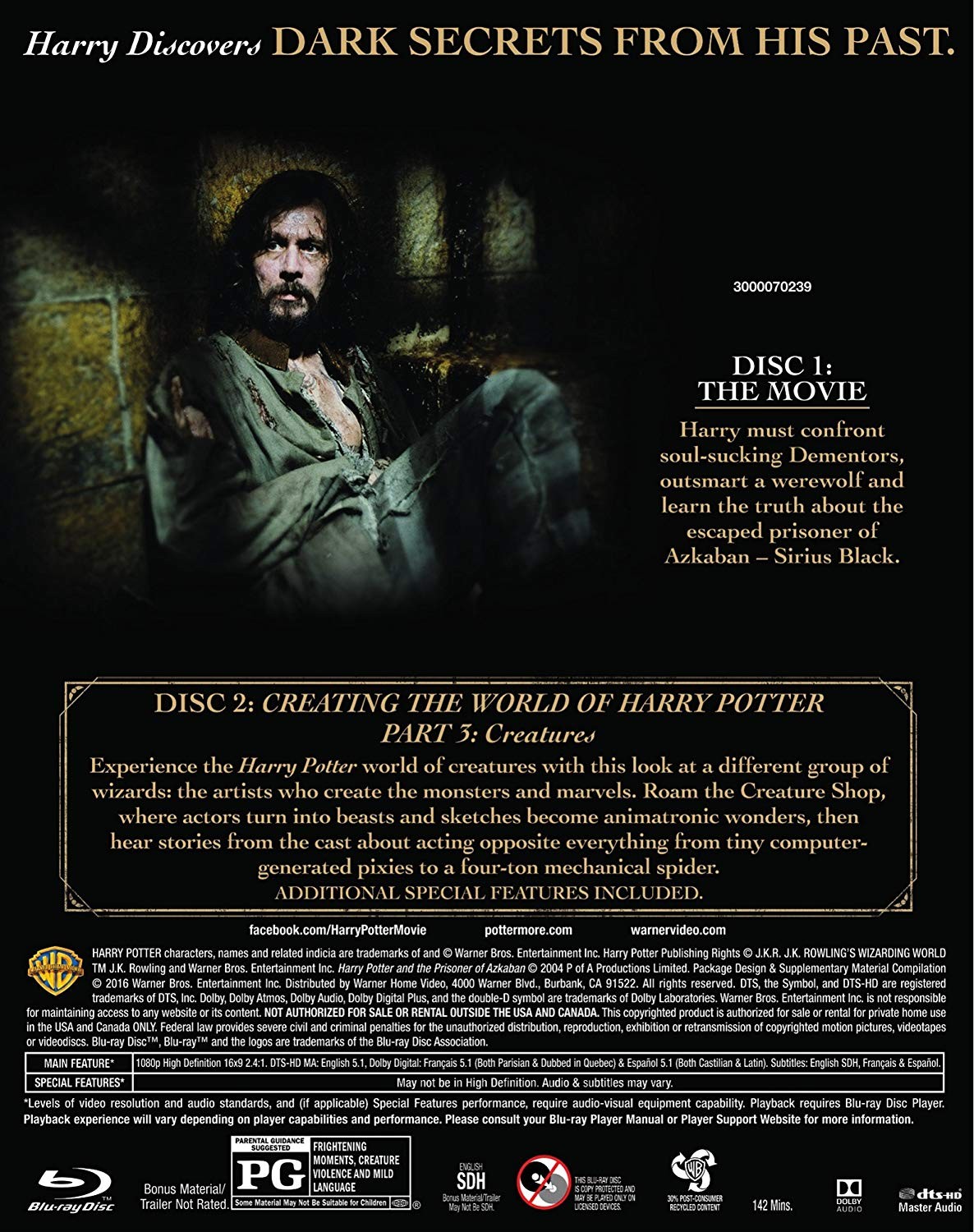 Cantidad de Discos: 2 | Lanzamiento: 2016 | Género(s): Aventura | Audio: Inglés, Francés, Español | SubtÃtulos: Francés, Español, Inglés | TÃtulo: Harry Potter- The Prisoner of Azkaban | Director(es): Alfonso Cuarón | Reparto: Daniel Radcliffe, Rupert Grint, Emma Watson, Robbie Coltrane, Michael Gambon | Norma / Región: NTSC (Región A) | Series: Harry Potter | Cantidad de Discos: 2 | Lanzamiento: 2016 | Género(s): Aventura | Audio: Inglés, Francés, Español | SubtÃtulos: Francés, Español, Inglés | TÃtulo: Harry Potter- The Prisoner of Azkaban | Director(es): Alfonso Cuarón | Reparto: Daniel Radcliffe, Rupert Grint, Emma Watson, Robbie Coltrane, Michael Gambon | Norma / Región: NTSC (Región A) | Series: Harry Potter