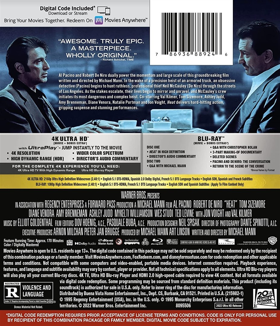 Reparto: Robert De Niro, Al Pacino, Val Kilmer, Jon Voight, Tom Sizemore, Ashley Judd, Diane Venora, Amy Brenneman, Natalie Portman, Mykelti Williamson, William Fichtner, Wes Studi, Ted Levine, Dennis Haysbert, Tom Noonan, Kevin Gage, Hank Azaria, Danny Trejo, Jeremy Piven, Xander Berkeley