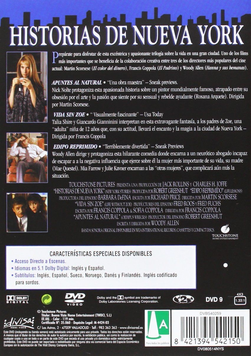 Cantidad de Discos: 1 | Lanzamiento: 1989 | Género(s): Drama | Audio: Inglés, Español | SubtÃtulos: Español, Inglés | TÃtulo: New York Stories (Historias de Nueva York) | Director(es): Martin Scorsese, Francis Ford Coppola, Woody Allen | Reparto: Nick Nolte, Rosanna Arquette, Steve Buscemi, Patrick O’Neal, Deborah Harry, Talia Shire, Heather McComb, Giancarlo Giannini, Carole Bouquet, Woody Allen, Mia Farrow, Julie Kavner, Mae Questel, Larry David, Adrien Brody, Illeana Douglas, Mark Boone Junior | Sub-CategorÃas: Comedia | Norma / Región: PAL (Región 2) | Cantidad de Discos: 1 | Lanzamiento: 1989 | Género(s): Drama | Audio: Inglés, Español | SubtÃtulos: Español, Inglés | TÃtulo: New York Stories (Historias de Nueva York) | Director(es): Martin Scorsese, Francis Ford Coppola, Woody Allen | Reparto: Nick Nolte, Rosanna Arquette, Steve Buscemi, Patrick O’Neal, Deborah Harry, Talia Shire, Heather McComb, Giancarlo Giannini, Carole Bouquet, Woody Allen, Mia Farrow, Julie Kavner, Mae Questel, Larr