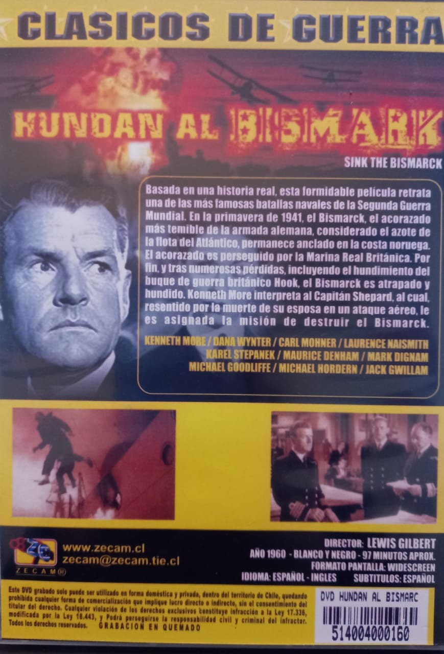 Cantidad de Discos: 1 DVD | Lanzamiento: 1960 | Género(s): BELICO | Audio: Español, Ingles | SubtÃtulos: Español | TÃtulo: Sink the Bismarck! | Director(es): Lewis Gilbert | Reparto: Kenneth More, Dana Wynter, Carl Möhner, Laurence Naismith, Karel Stepanek, Maurice Denham, Mark Dignam, Michael Goodliffe, Jack Gwillim, Michael Hordern, Geoffrey Keen, Esmond Knight, Jack Watling, | Norma / Región: NTSC , REGION 4 | Cantidad de Discos: 1 DVD | Lanzamiento: 1960 | Género(s): BELICO | Audio: Español, Ingles | SubtÃtulos: Español | TÃtulo: Sink the Bismarck! | Director(es): Lewis Gilbert | Reparto: Kenneth More, Dana Wynter, Carl Möhner, Laurence Naismith, Karel Stepanek, Maurice Denham, Mark Dignam, Michael Goodliffe, Jack Gwillim, Michael Hordern, Geoffrey Keen, Esmond Knight, Jack Watling, | Norma / Región: NTSC , REGION 4