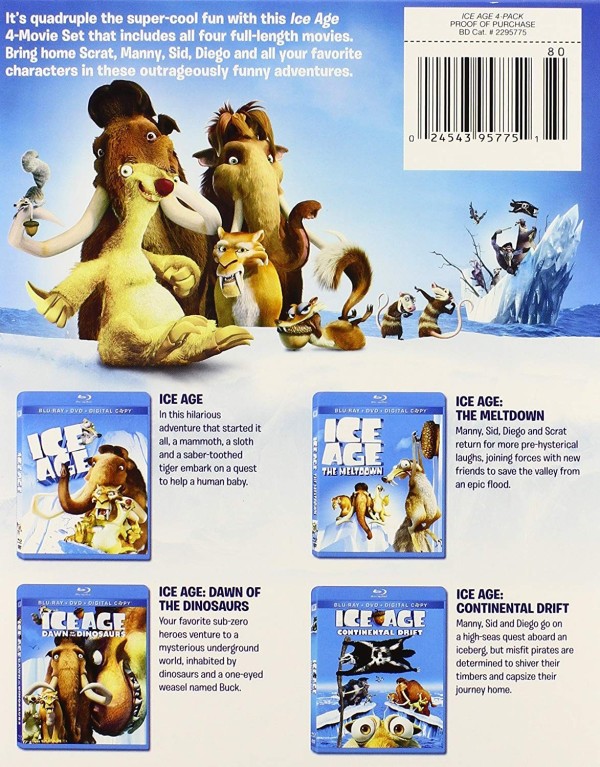 Cantidad de Discos: 11 | Lanzamiento: 2014 | Género(s): Infantil, Aventura, Familia, Comedia, Animales animados | Audio: Inglés, Español, Francés | SubtÃtulos: Francés, Español | TÃtulo: Ice Age – 4 Movie Set | Director(es): Chris Wedge