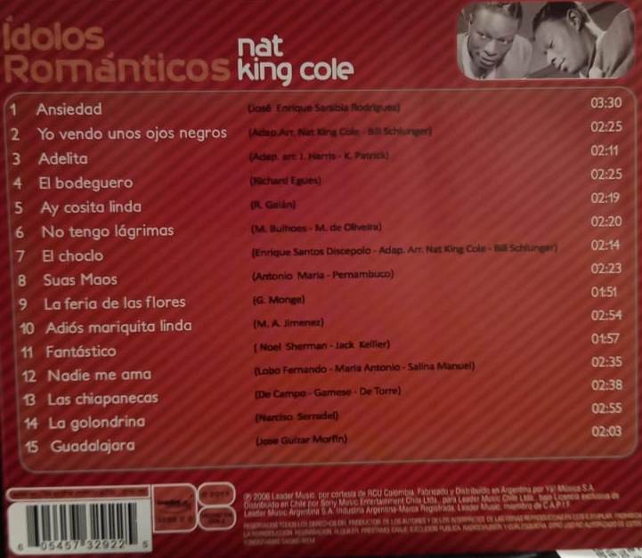 Artista(s) / Grupo: Nat King Cola | Cantidad de Discos: 1 | Lanzamiento: 2006 | Género(s): Jazz, Funk / Soul, Pop | Estilo(s): Jazz, Vocal, Pop | Título: Idolos Románticos | Artista(s) / Grupo: Nat King Cola | Cantidad de Discos: 1 | Lanzamiento: 2006 | Género(s): Jazz, Funk / Soul, Pop | Estilo(s): Jazz, Vocal, Pop | Título: Idolos Románticos