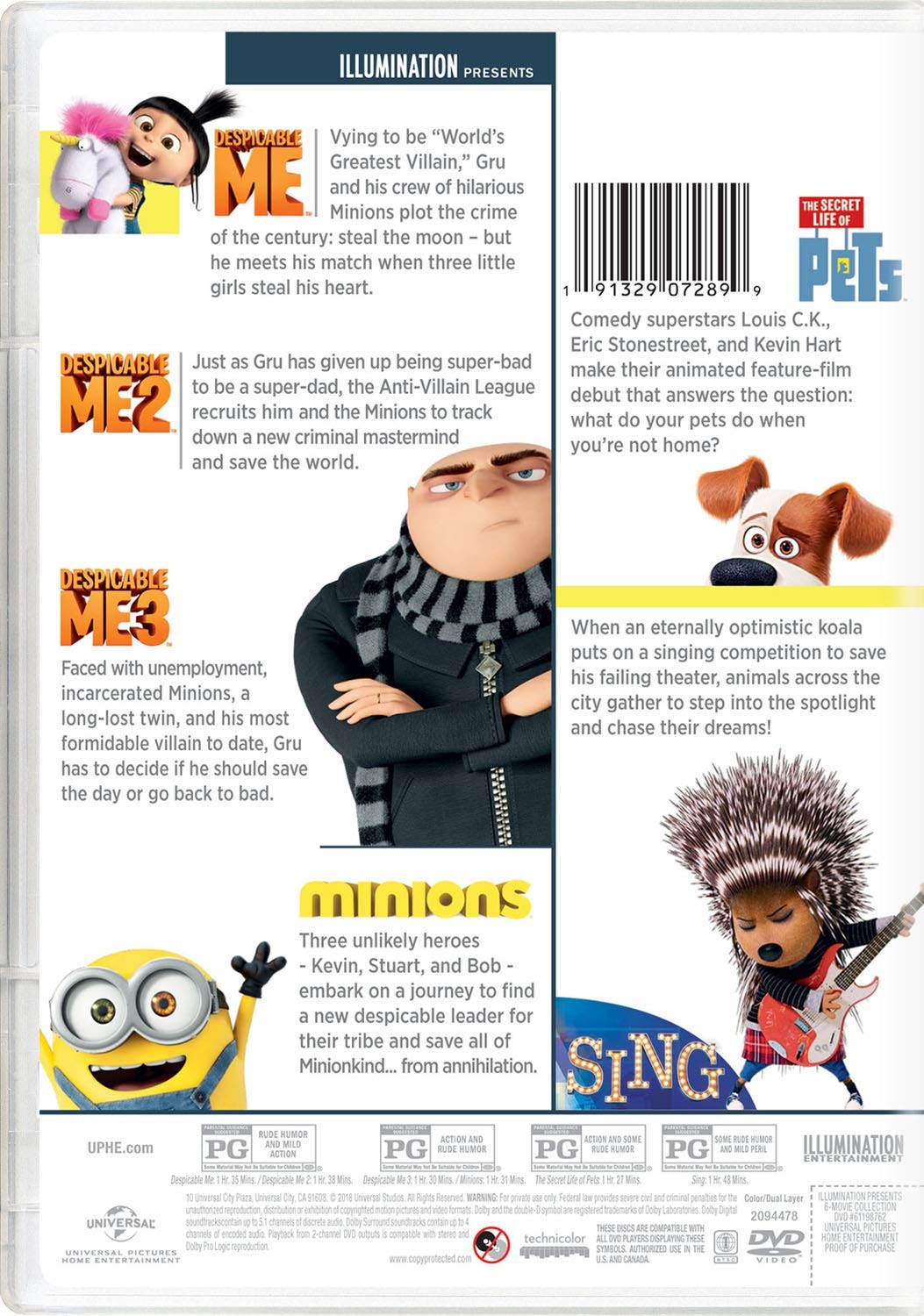 Cantidad de Discos: 6 | Lanzamiento: 2018 | Género(s): Animación | Audio: Inglés (Dolby Digital 5,1), Español (Dolby Digital Stereo, Dolby Digital 5,1), Francés (Dolby Digital Stereo, Dolby Digital 5,1) | SubtÃtulos: Español, Inglés, Francés | TÃtulo: Mi villano favorito (2010) / Mi villano favorito 2 (2013) / Mi villano favorito 3 (2017) / Minions (2015) / La vida secreta de las mascotas (2016) / Ven y canta (2017) | Director(es): Pierre Coffin, Chris Renaud / Cinco Paul, Ken Daurio, Brian Lynch / Garth Jennings, Christophe Lourdelet | Reparto: Animación | Norma / Región: NTSC 1 | Series: Illumination | Cantidad de Discos: 6 | Lanzamiento: 2018 | Género(s): Animación | Audio: Inglés (Dolby Digital 5,1), Español (Dolby Digital Stereo, Dolby Digital 5,1), Francés (Dolby Digital Stereo, Dolby Digital 5,1) | SubtÃtulos: Español, Inglés, Francés | TÃtulo: Mi villano favorito (2010) / Mi villano favorito 2 (2013) / Mi villano favorito 3 (2017) / Minions (2015) / La vida secreta de las masc