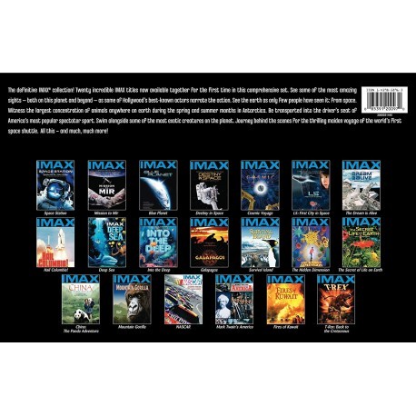 La colección definitiva de IMAX 20 increÃbles tÃtulos IMAX ahora disponibles juntos por primera vez en este conjunto integral. Vea algunos de los lugares más sorprendentes, tanto en este planeta como más allá, ya que algunos de los actores más conocidos de Hollywood narran la acción. Ver la tierra como pocas personas lo han visto: desde el espacio. Sea testigo de la mayor concentración de animales en cualquier lugar de la tierra durante los meses de primavera y verano en la Antártida. Ser transportado al asiento del conductor del deporte de espectadores más popular de Estados Unidos. Nada junto a algunas de las criaturas más exóticas del planeta. Viaje detrás de escena para el emocionante viaje inaugural del primer transbordador espacial del mundo.