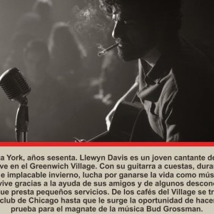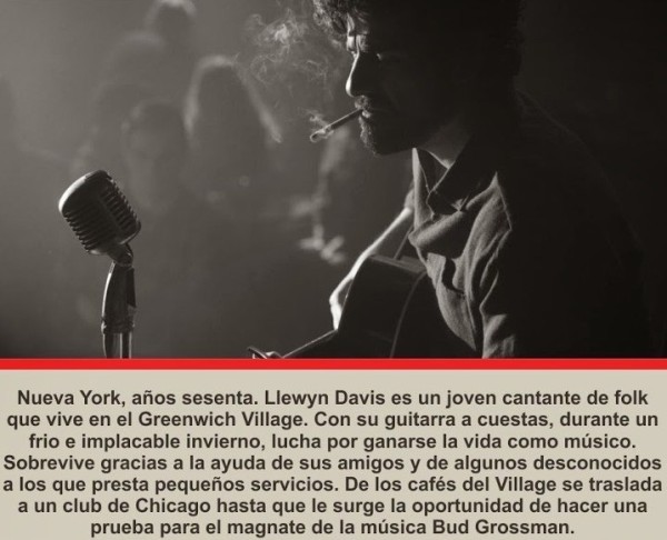 Nueva York, 1961. Llewyn Davis (Oscar Isaac) es un joven cantante de folk que vive de mala manera en el Greenwich Village. Durante un gélido invierno, con su guitarra a cuestas, sin casa fija y sin apenas dinero lucha por ganarse la vida como músico. Sobrevive cantando en pequeños garitos, pero, sobre todo, gracias a la ayuda de algunos amigos que le prestan su sofá para pasar las frÃas noches. De repente, decide viajar a Chicago para hacer una prueba para el magnate de la música Bud Grossman.