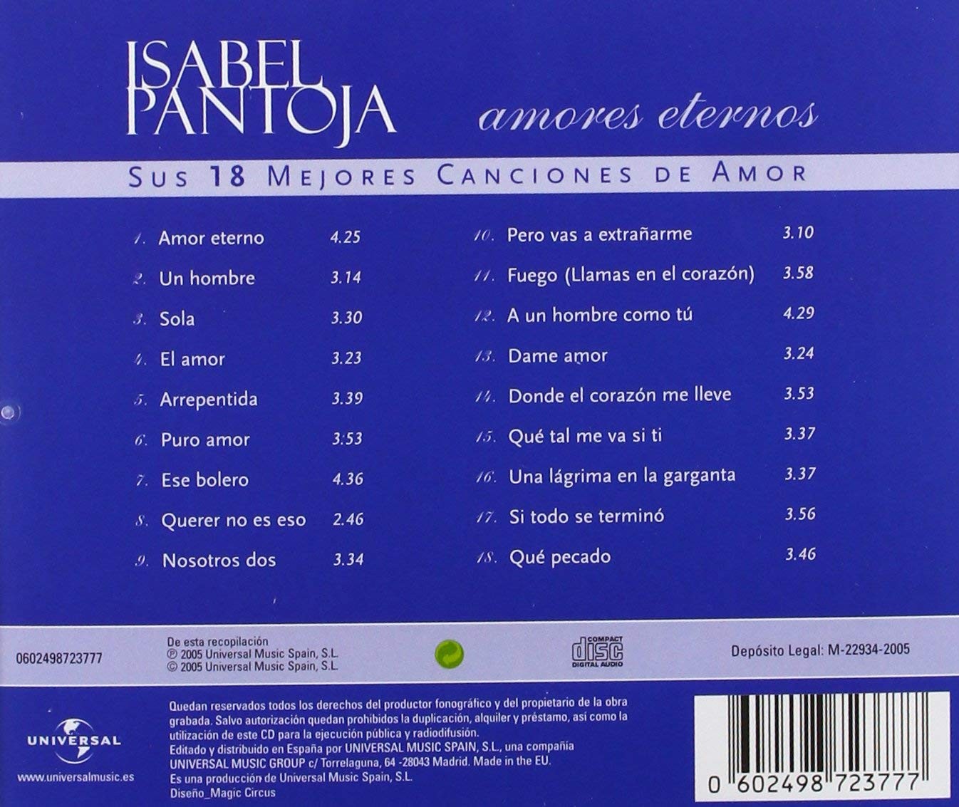 Artista(s) / Grupo: Isabel Pantoja | Cantidad de Discos: 1 | Lanzamiento: 2017 | Género(s): Pop Latino | TÃtulo: amores eternos | Artista(s) / Grupo: Isabel Pantoja | Cantidad de Discos: 1 | Lanzamiento: 2017 | Género(s): Pop Latino | TÃtulo: amores eternos